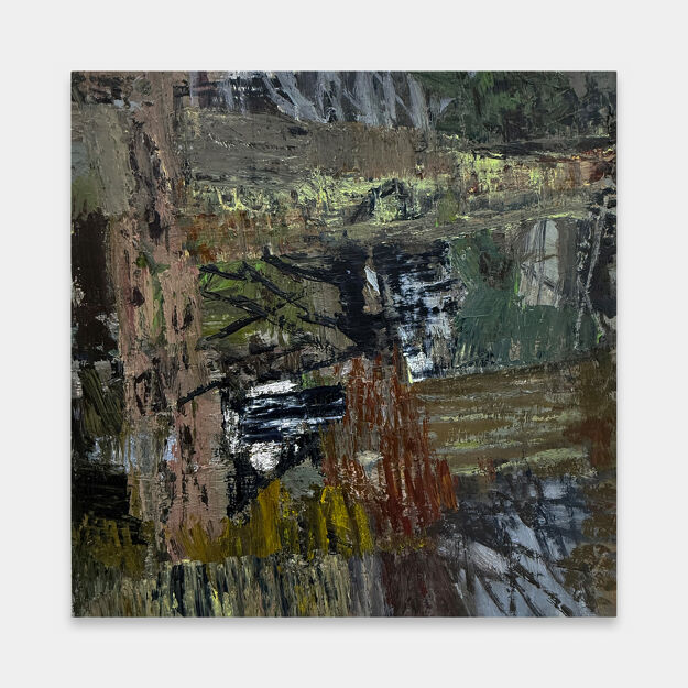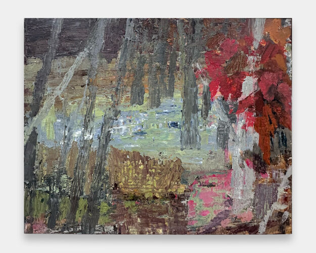 Rather than depicting grand, panoramic vistas in the tradition of 19th-century Romantic painters, Logue works from within the landscape itself—immersed in dense forest undergrowth, the reflective surfaces of boggy ponds, and the shifting hues of seasonal change. Her paintings inhabit a dynamic space between abstraction and representation, echoing the influence of artists such as John Marin and John Walker.