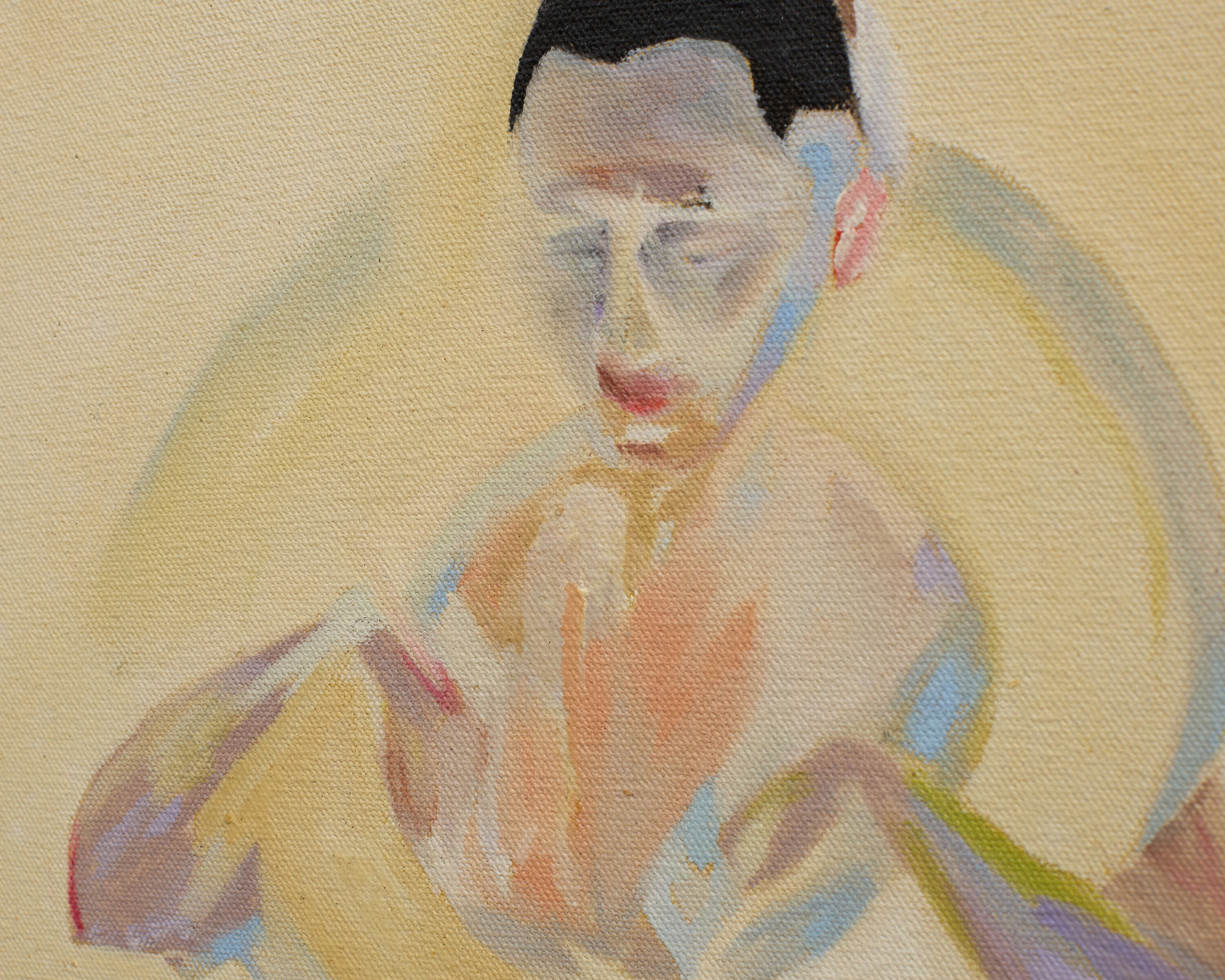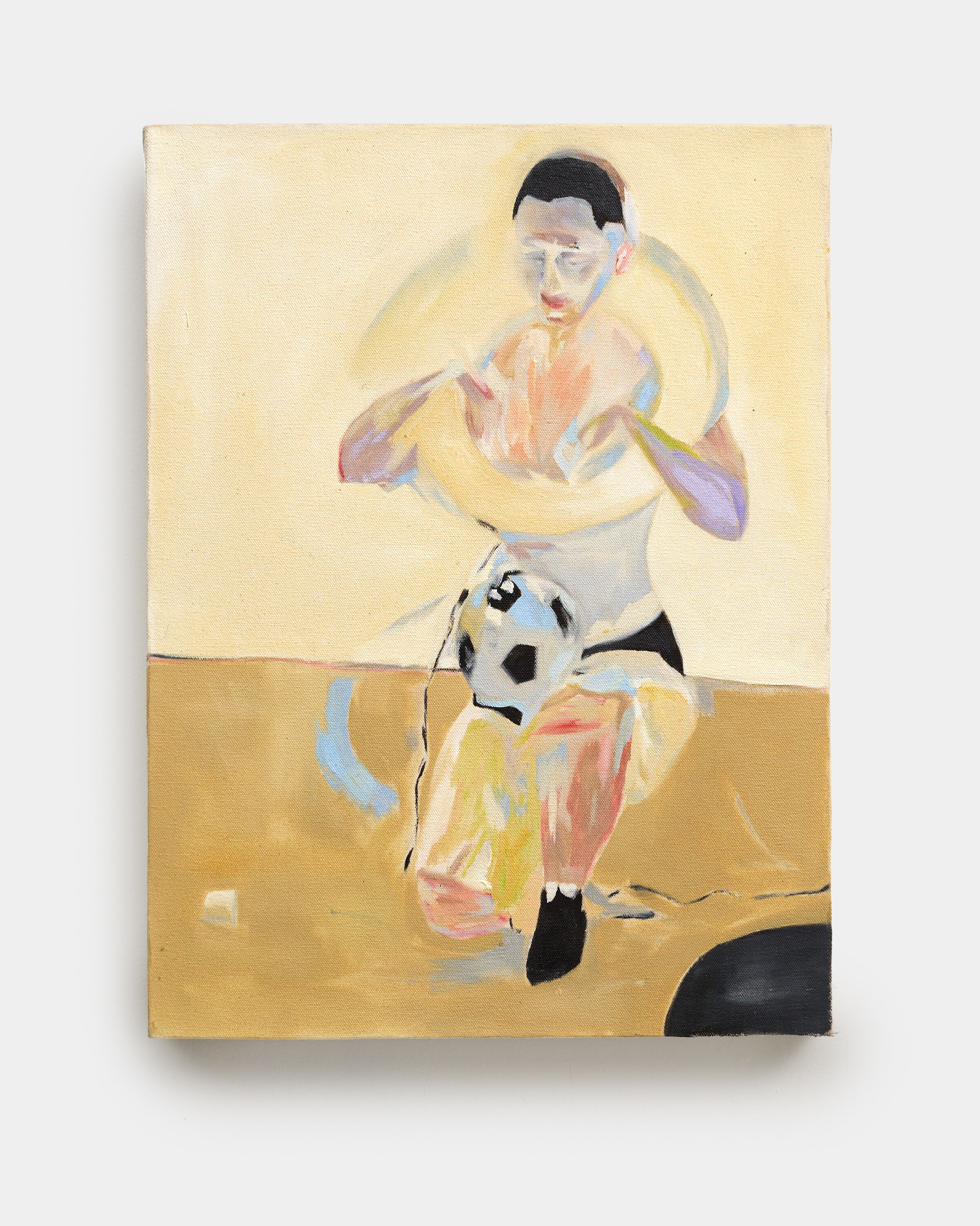 Many of Schmidt's painted works trace real and imagined rehearsals, performances, and scores. Paintings are featured as actors and props in live performances, creating the effect of a hall of mirrors. Intern Nanny Mommy Boss IV was painted after documentation (photographs taken by the artist Craig Jun Li) of Intern Nanny Mommy Boss (2022, live performance, 15 minutes).