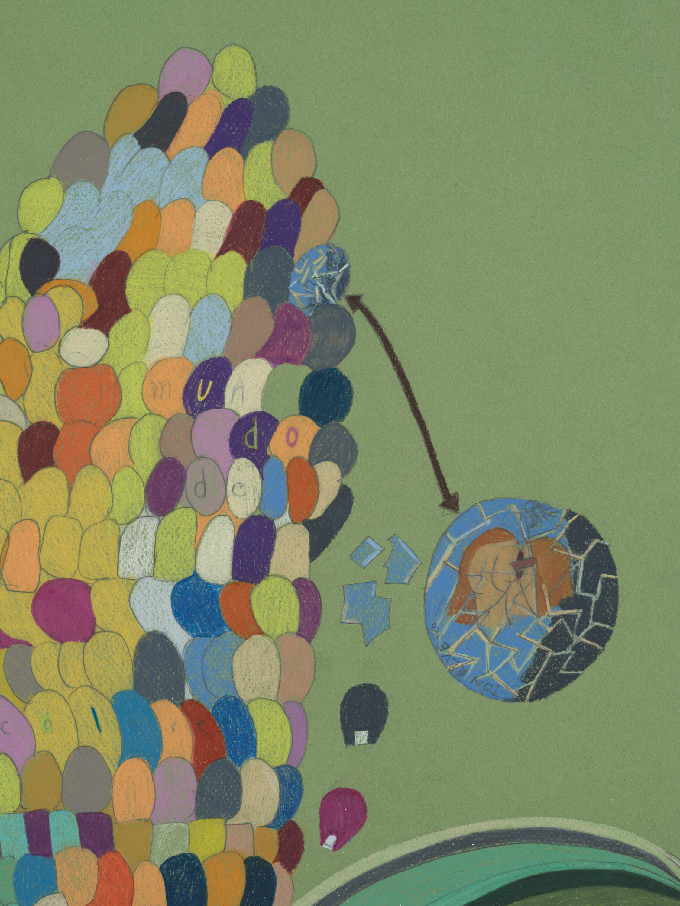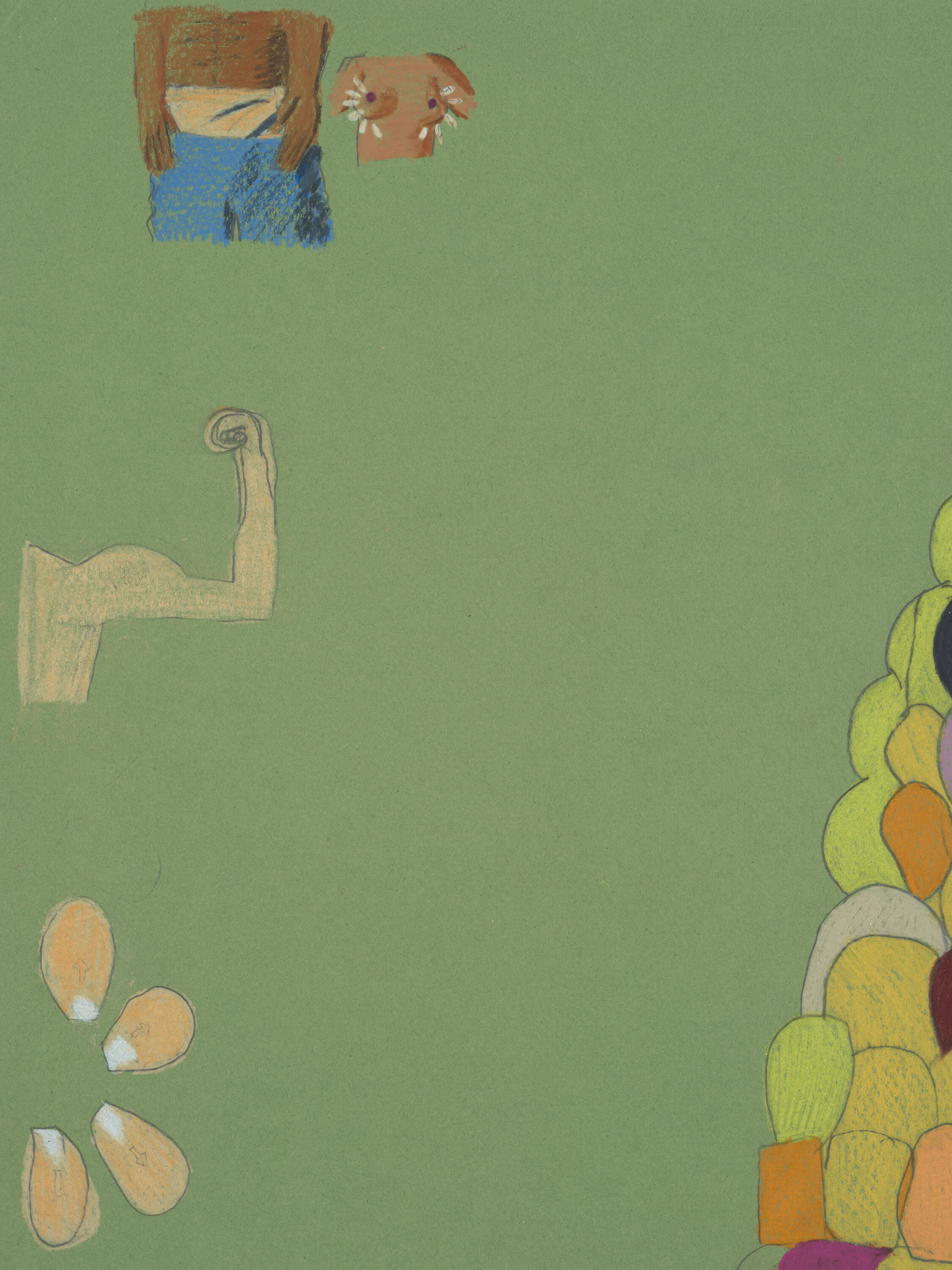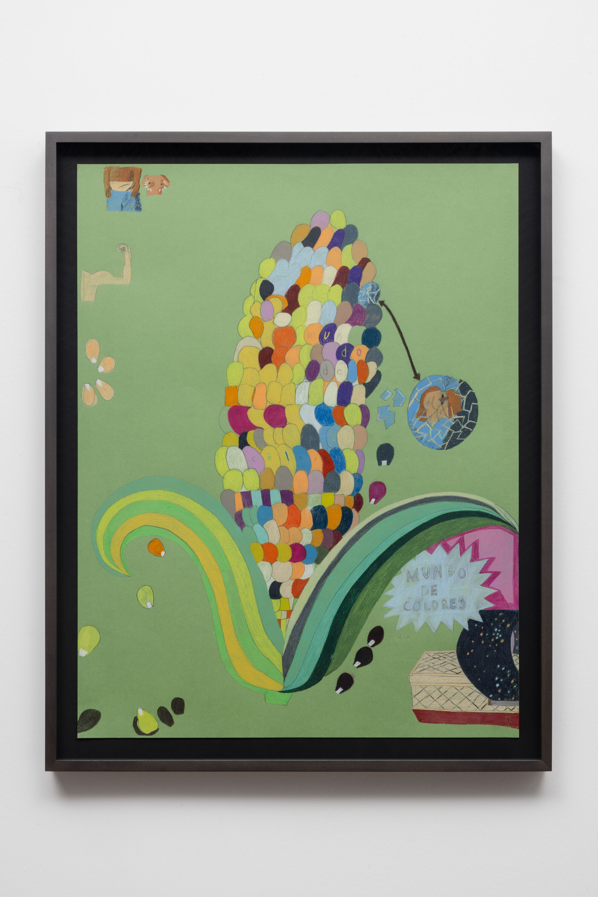 On vibrant green paper, this drawing presents the world in all its pleasure, sweetness, and color. Ferrand celebrates abundance, depicting a gigantic, multicolored cob of corn as if it were a piece of candy. The genetically modified perfection of the corn blurs the line between nature and artifice, desire and excess. The result is a playful yet pointed meditation on consumption, spectacle, and engineered beauty.