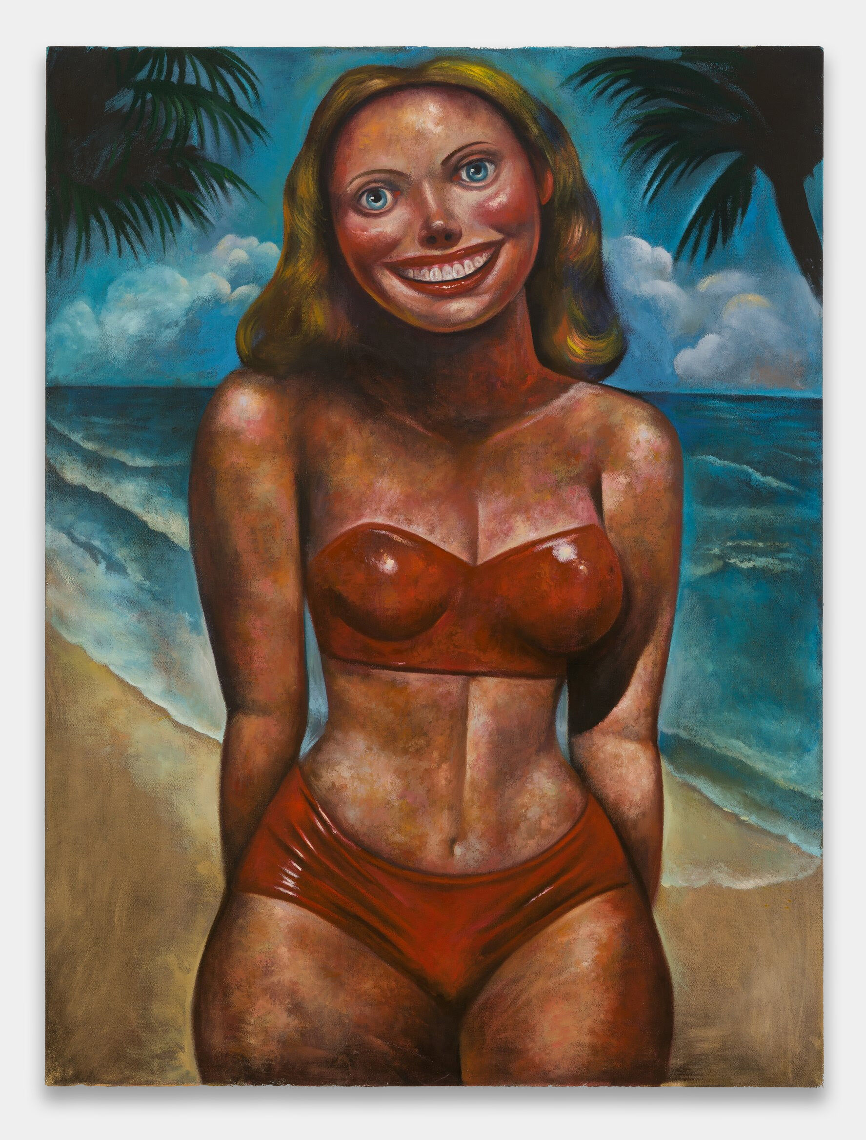 Angulo’s practice interrogates human psychology through stylized vignettes of doll-like figures that masterfully tread between the idyllic and the unsettling. Depicting exaggerated and heavily sexualized bodies, her subjects confront us with disconcerting, wide-eyed gazes and stiff smiles. These saturated works aim to deconstruct notions of perfection and imposed limitations of being, visually riffing on art history and other sources ranging from newspaper comic strips to mid-twentieth century pin ups.