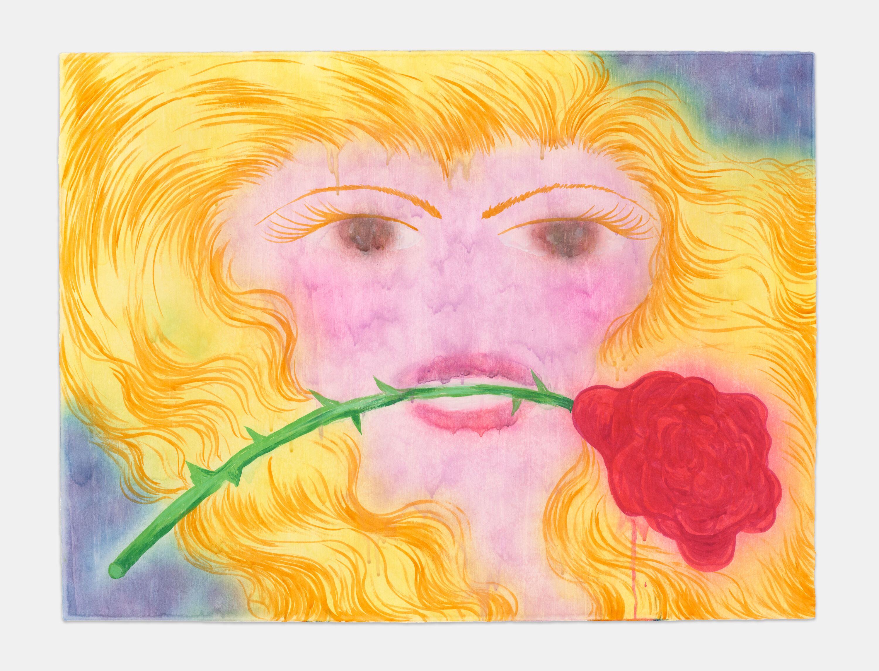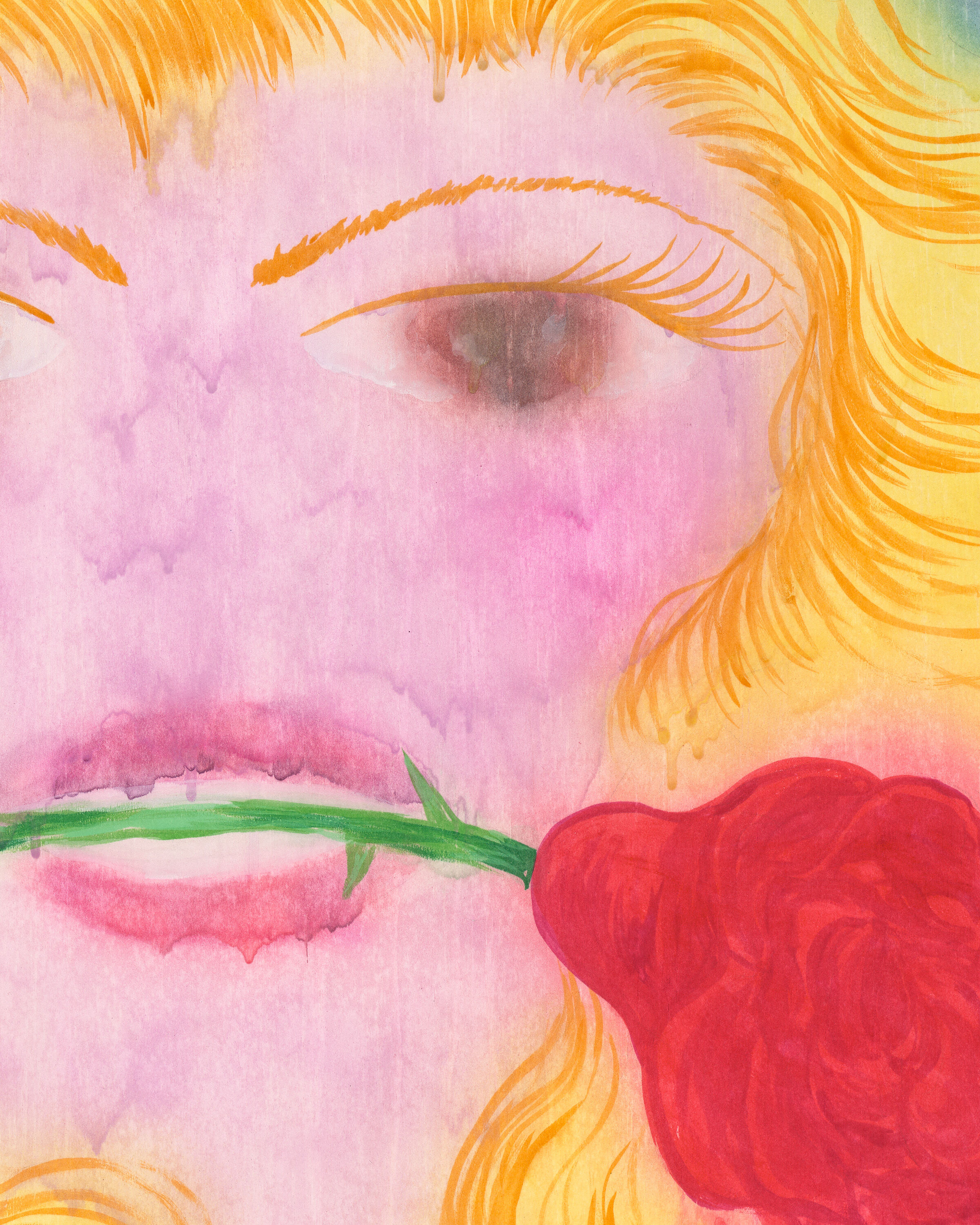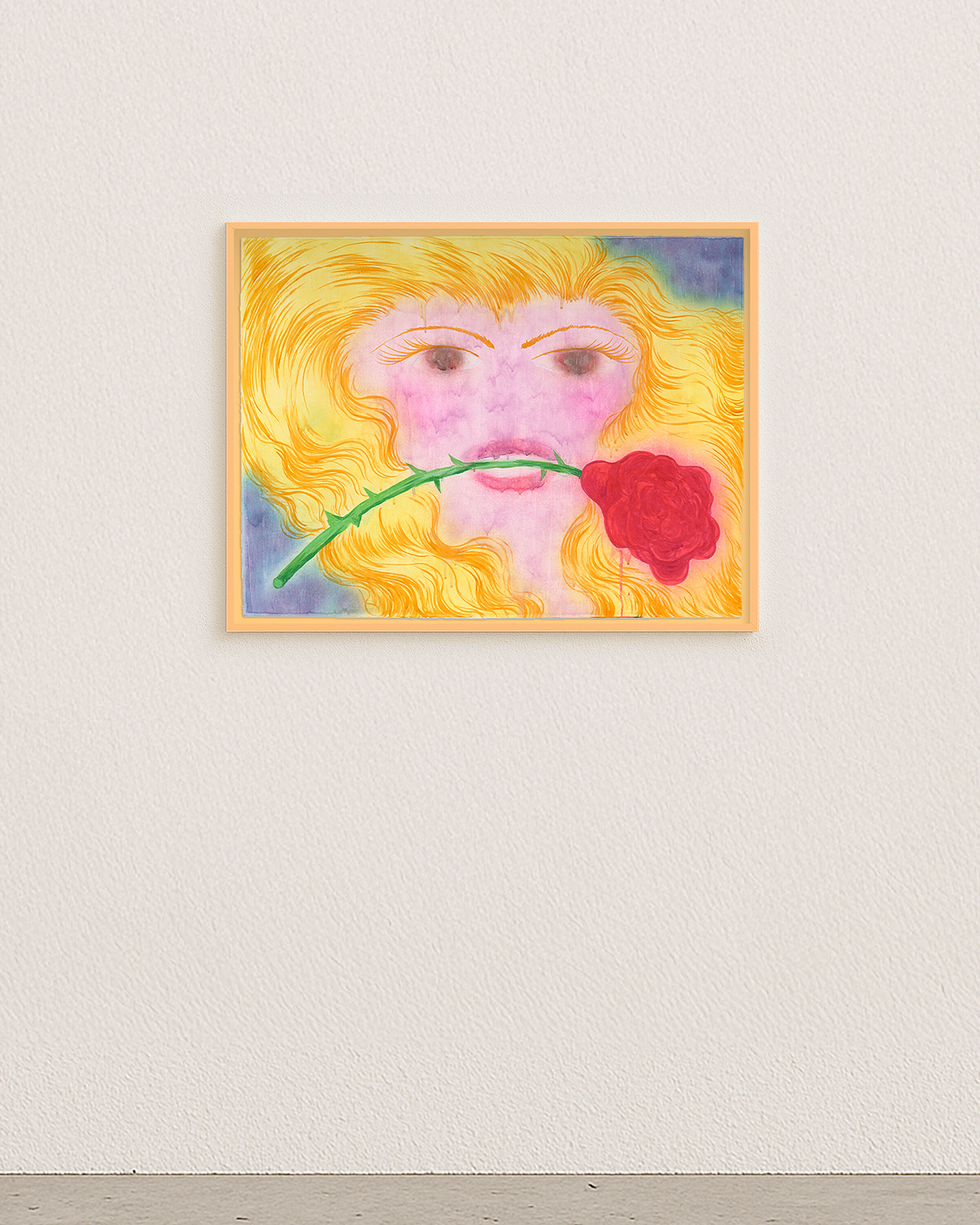 In this series, muscular, self-possessed female figures exist in deliberate tension with delicate blooms. The juxtaposition amplifies the humor and complexity in how femininity is performed, perceived, and mythologized. In this particular piece, a woman holds a rose in her mouth—an image at once sensual and absurd, poised yet unnatural. She recalls both classical muse and pop-culture icon, evoking The Bachelor’s rose as a token of male approval. By reclaiming that symbol, the artist reimagines the flower not as ornament or offering, but as a site of resistance, irony, and strength.