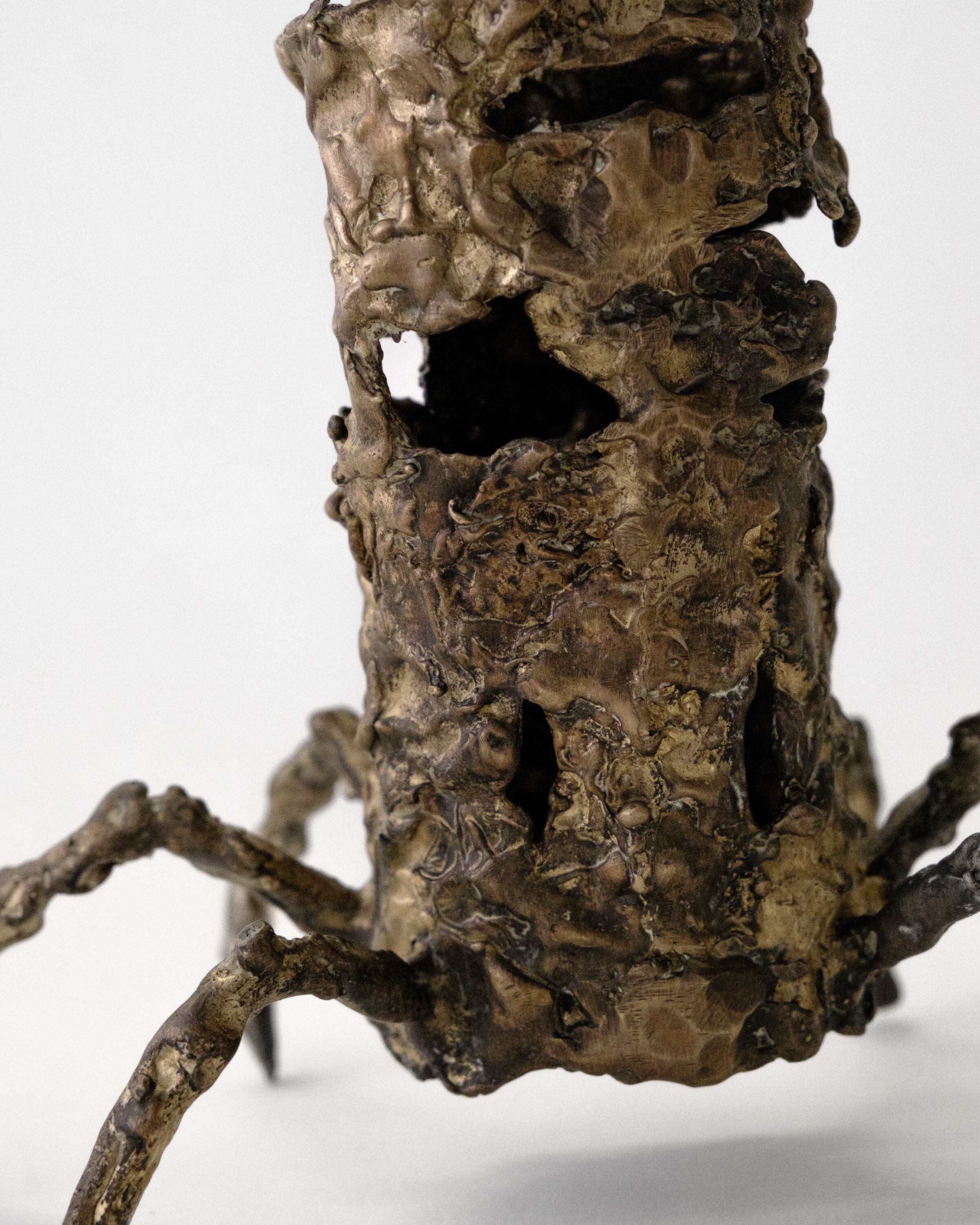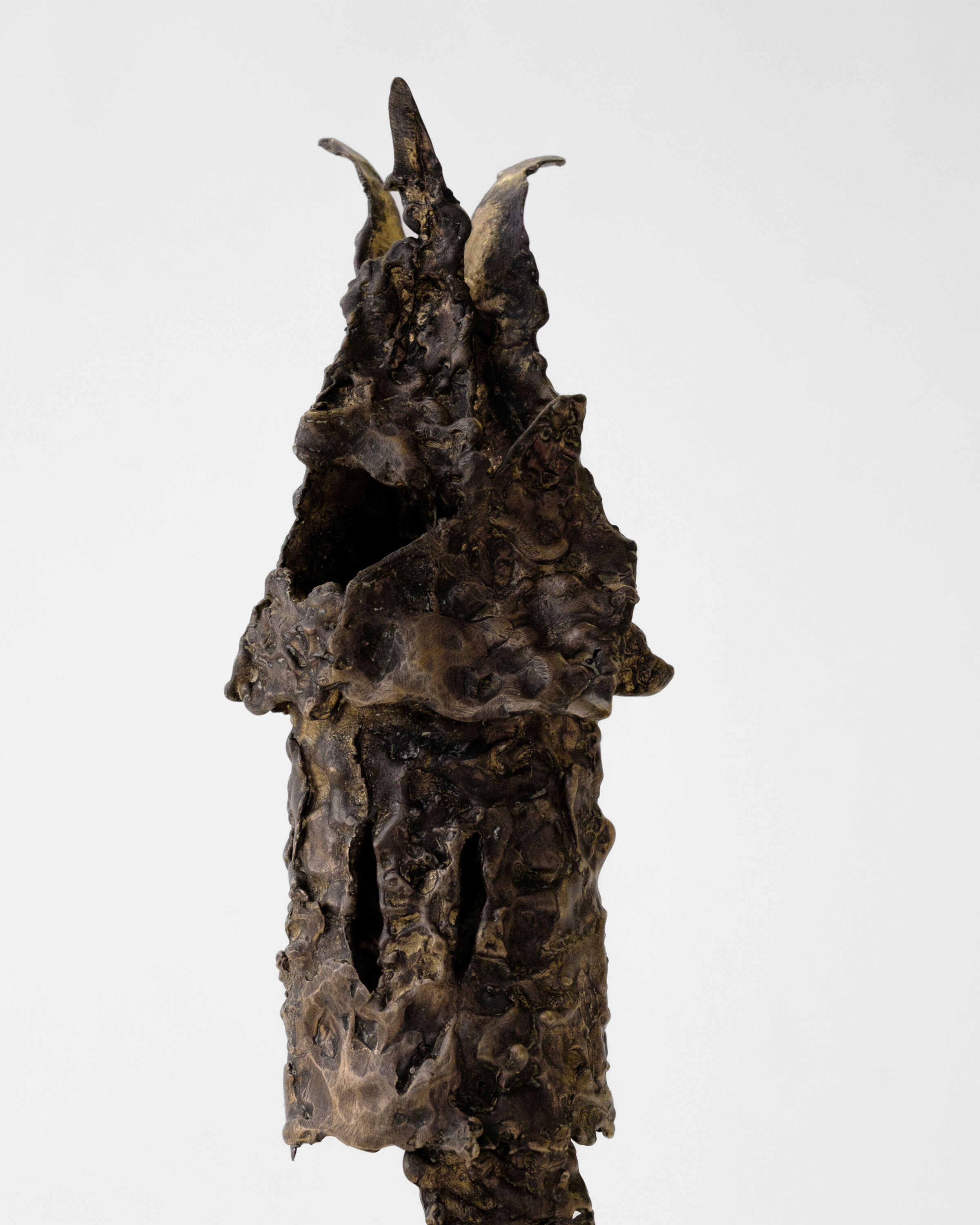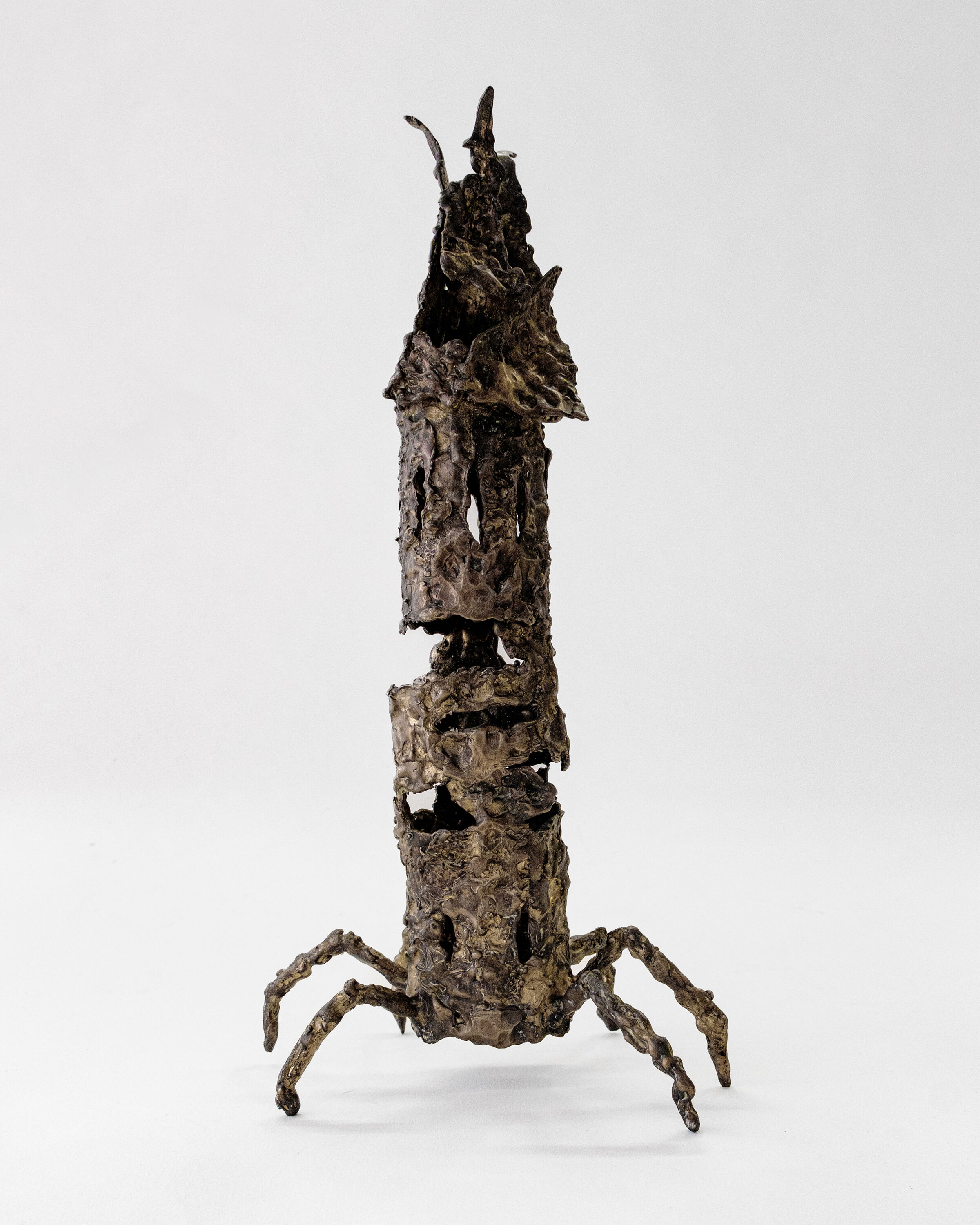 Working between sculpture, functional objects, and jewelry, Antonia Pinter creates pieces that suggest narratives while preserving their mysteries. Beginning in wax and later cast in metals such as brass, bronze, and aluminum, Pinter employs a transformative process that shapes energy and imagination into material form. Her works—including candelabras, elf houses, vessels, and bells—transcend mere function, becoming objects of spiritual resonance that blur the line between utility and sculpture. Pinter’s background in publication and poetry manifests in her use of mythic lore and repeated glyphs, forming a sculptural language that evokes myth, ritual, and the collective unconscious.