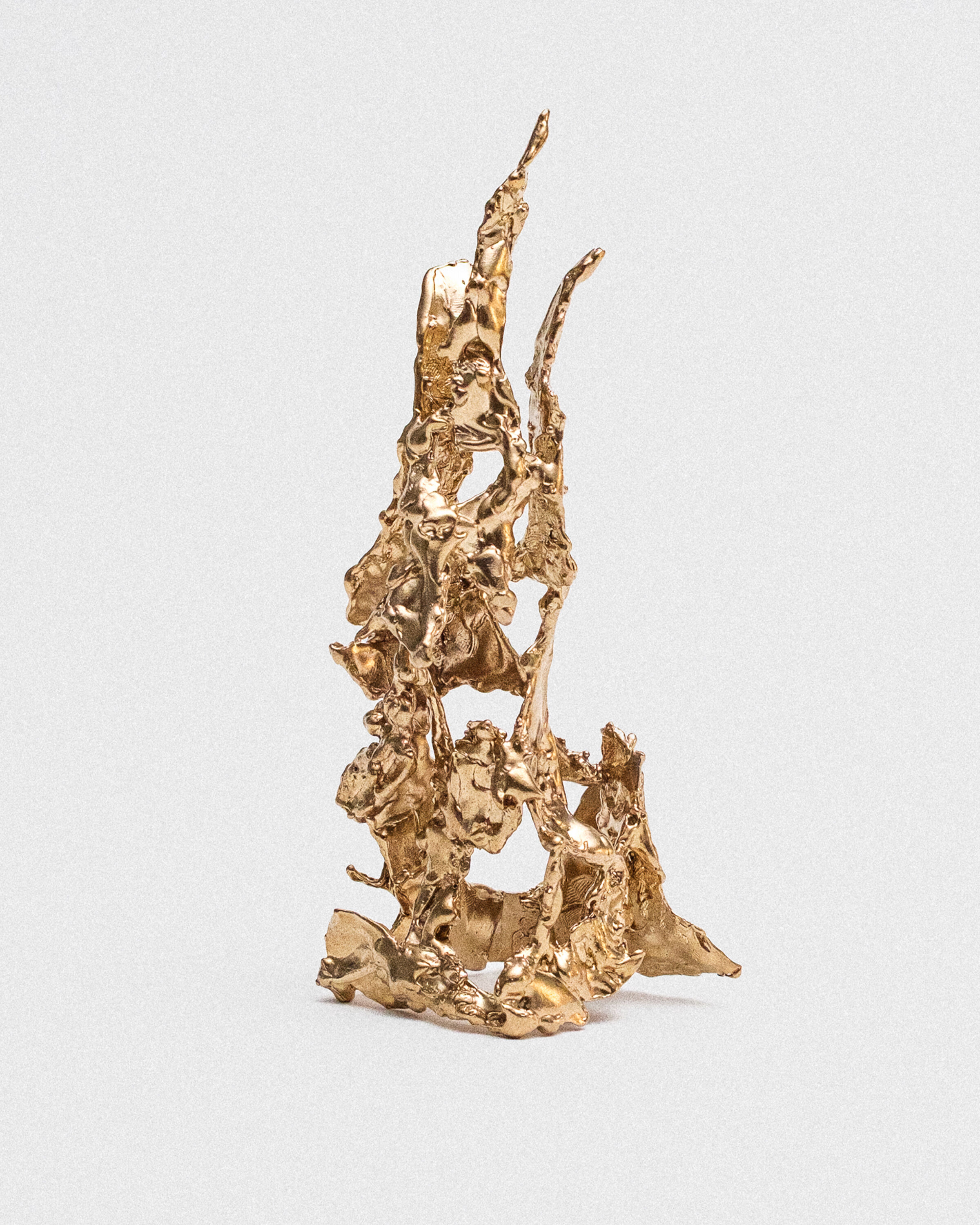Working between sculpture, functional objects, and jewelry, Antonia Pinter creates pieces that suggest narratives while preserving their mysteries. Beginning in wax and later cast in metals such as brass, bronze, and aluminum, Pinter employs a transformative process that shapes energy and imagination into material form. Her works—including candelabras, elf houses, vessels, and bells—transcend mere function, becoming objects of spiritual resonance that blur the line between utility and sculpture. Pinter’s background in publication and poetry manifests in her use of mythic lore and repeated glyphs, forming a sculptural language that evokes myth, ritual, and the collective unconscious.