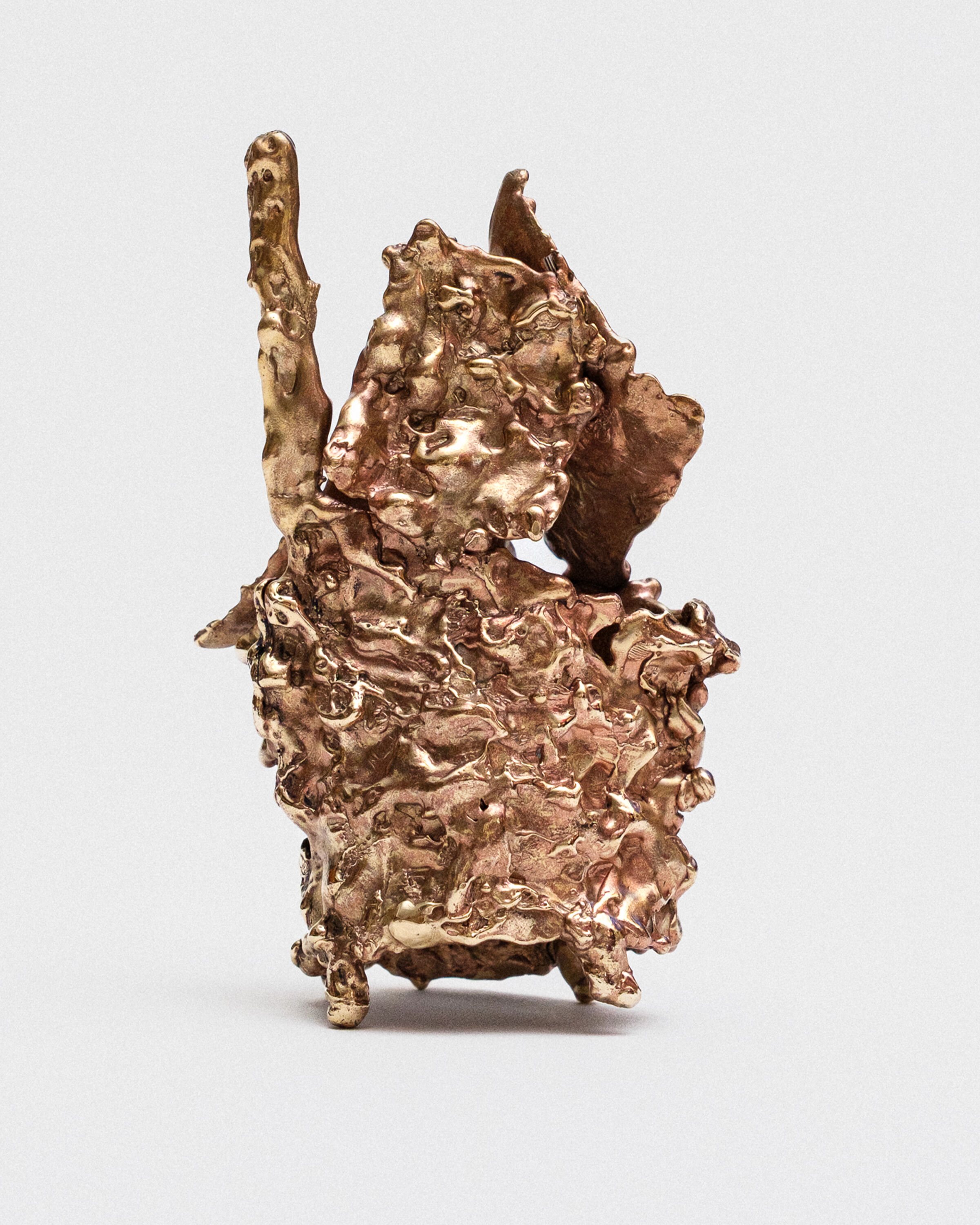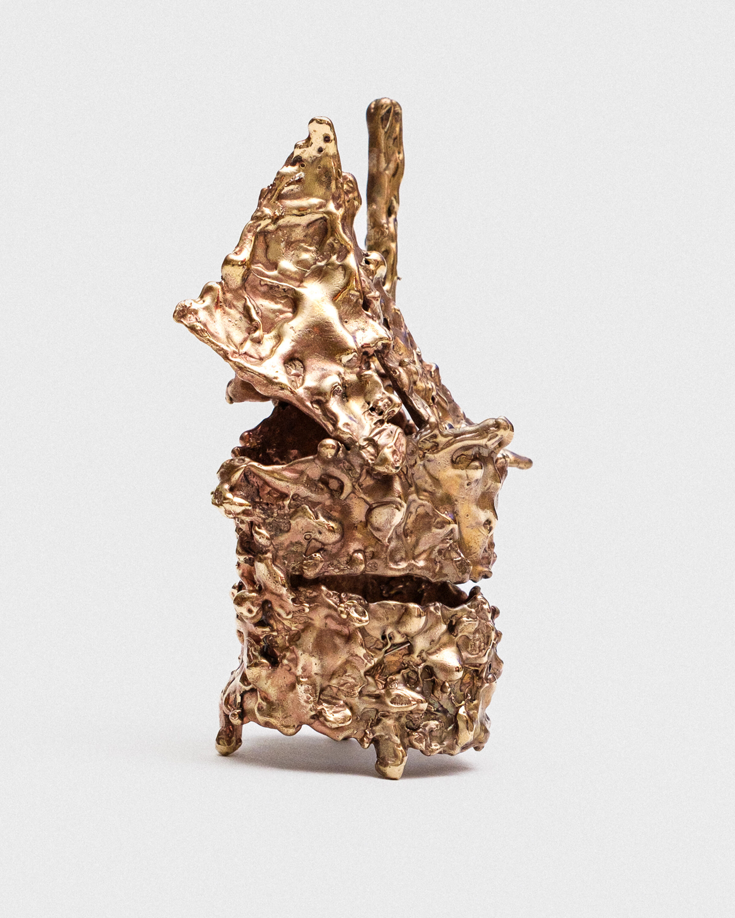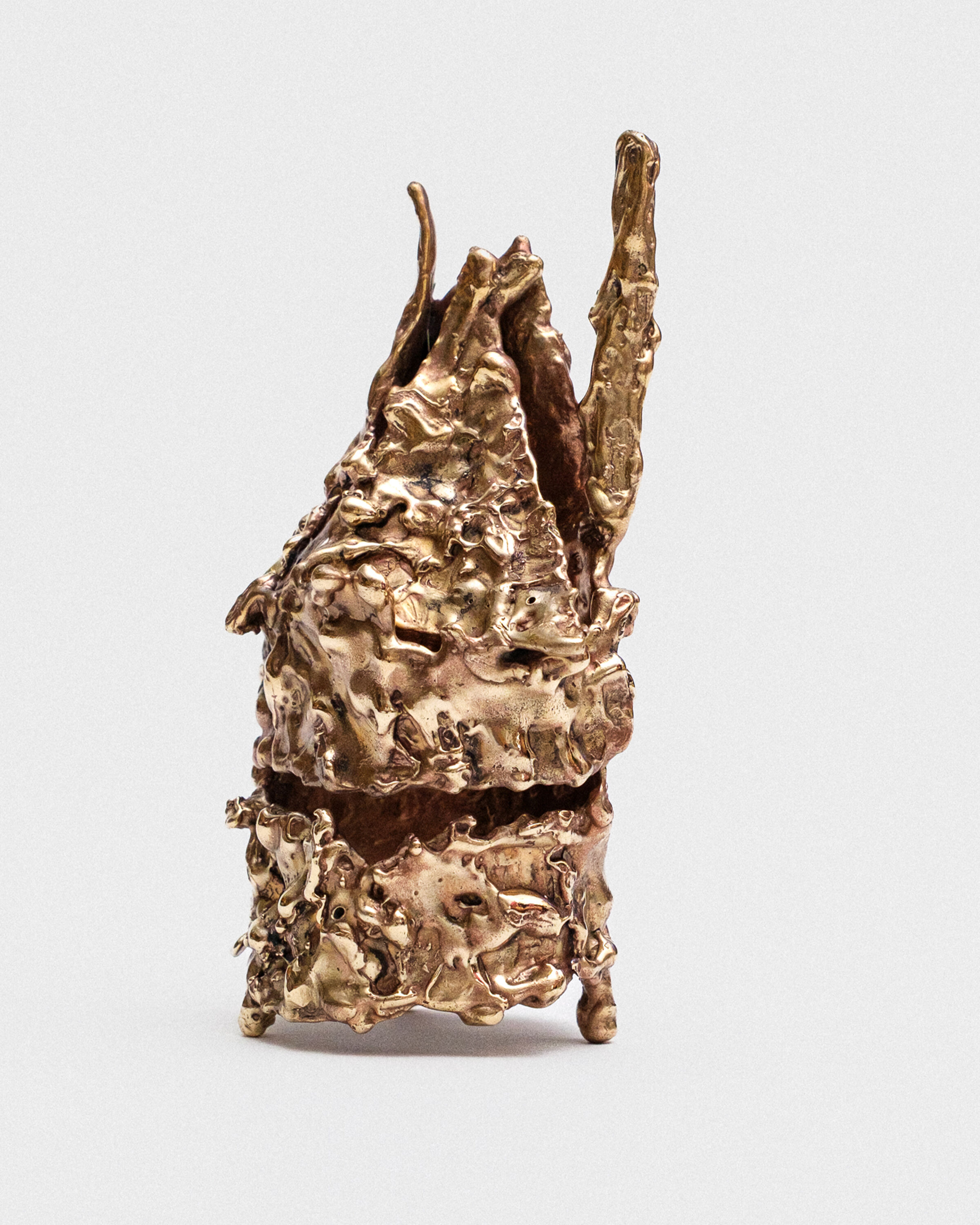 Working between sculpture, functional objects, and jewelry, Antonia Pinter creates pieces that suggest narratives while preserving their mysteries. Beginning in wax and later cast in metals such as brass, bronze, and aluminum, Pinter employs a transformative process that shapes energy and imagination into material form. Her works—including candelabras, elf houses, vessels, and bells—transcend mere function, becoming objects of spiritual resonance that blur the line between utility and sculpture. Pinter’s background in publication and poetry manifests in her use of mythic lore and repeated glyphs, forming a sculptural language that evokes myth, ritual, and the collective unconscious.