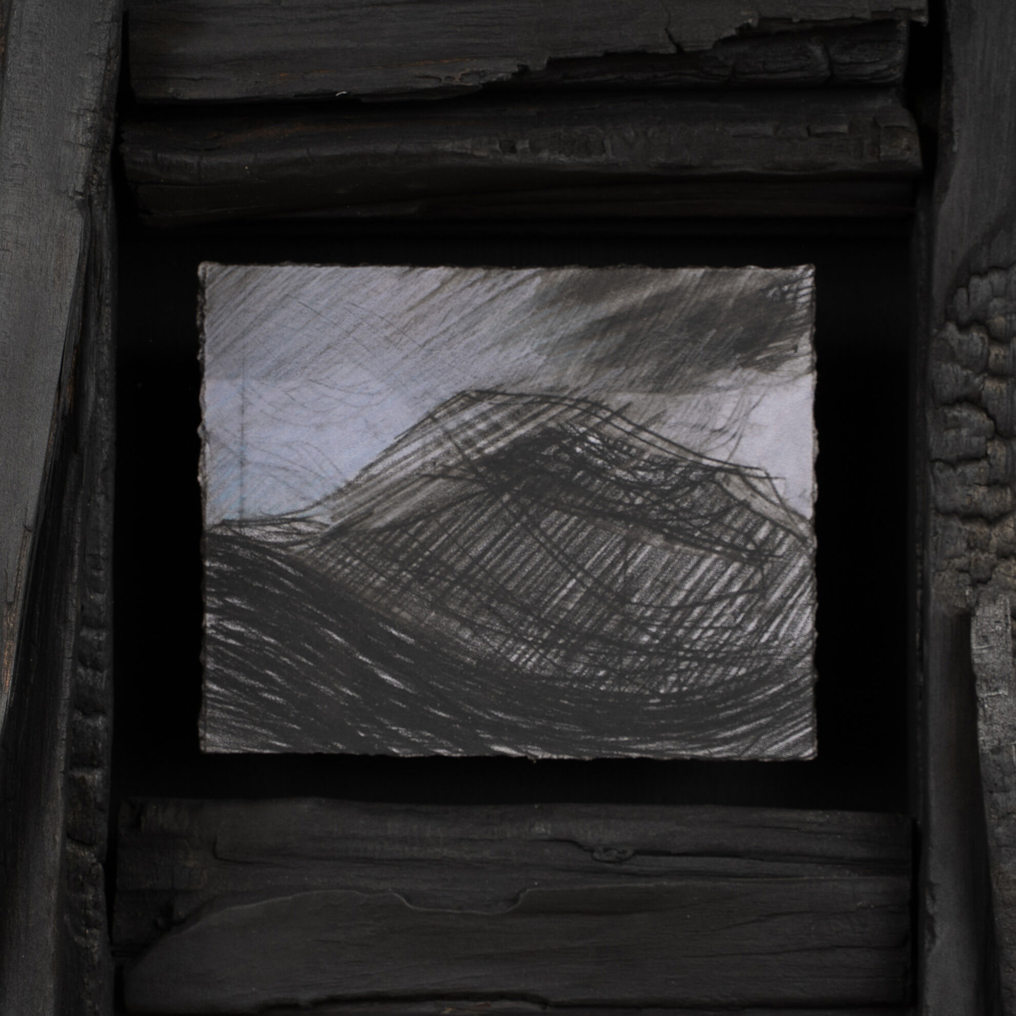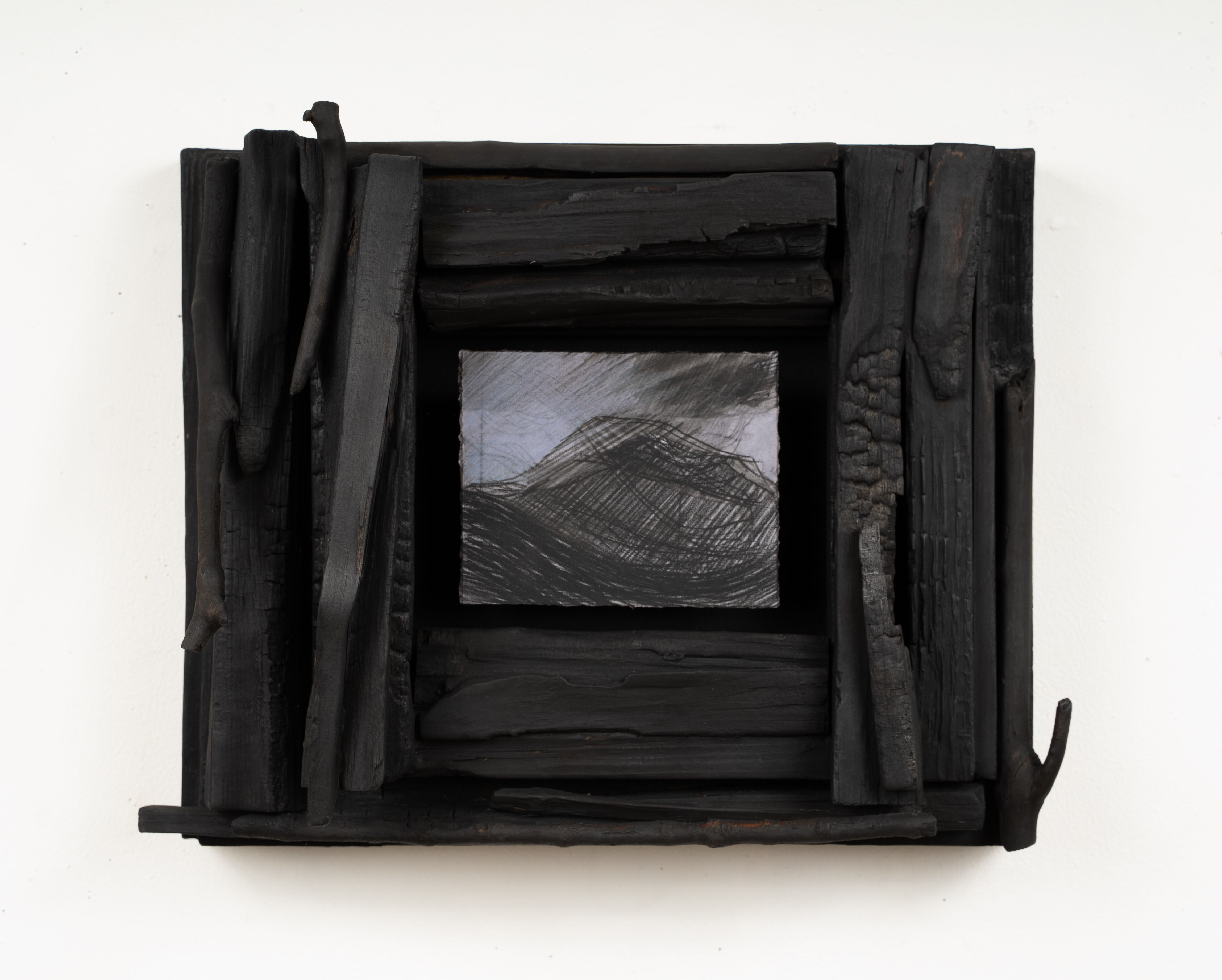The frames are made from downed trees and branches collected during the Summer. Using a chainsaw, axe and knife I process these trees into portions of wood that I transform into homes - nests - for the drawings. I then heavily char the frames with a blowtorch. Other frames - hand built and tenderly sanded - are stained with organic materials, the patina of these frames occurs after the application and rubbing away of many layers. When used as drawing material and as protective housing for the drawings, the seemingly destroyed charred remains of fire make way for new ideas, images and objects, creating space for hope and regeneration within the collapse and destruction that surrounds us."
