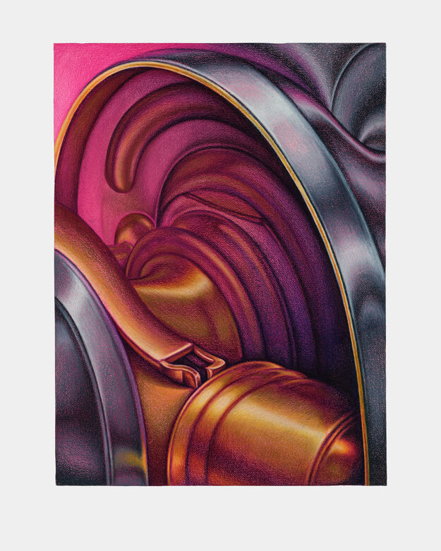 In this drawing, the artist has constructed a fantasy of queer joy using the gauzy patina of vintage porn and the delicate geometries of nature. Vision and touch get thoroughly intertwined in these found images of hunky figures, which the artist has embedded in a vibrant landscape of cactus blooms—a provocative metaphor for the allure yet potential danger of queer cruising grounds.