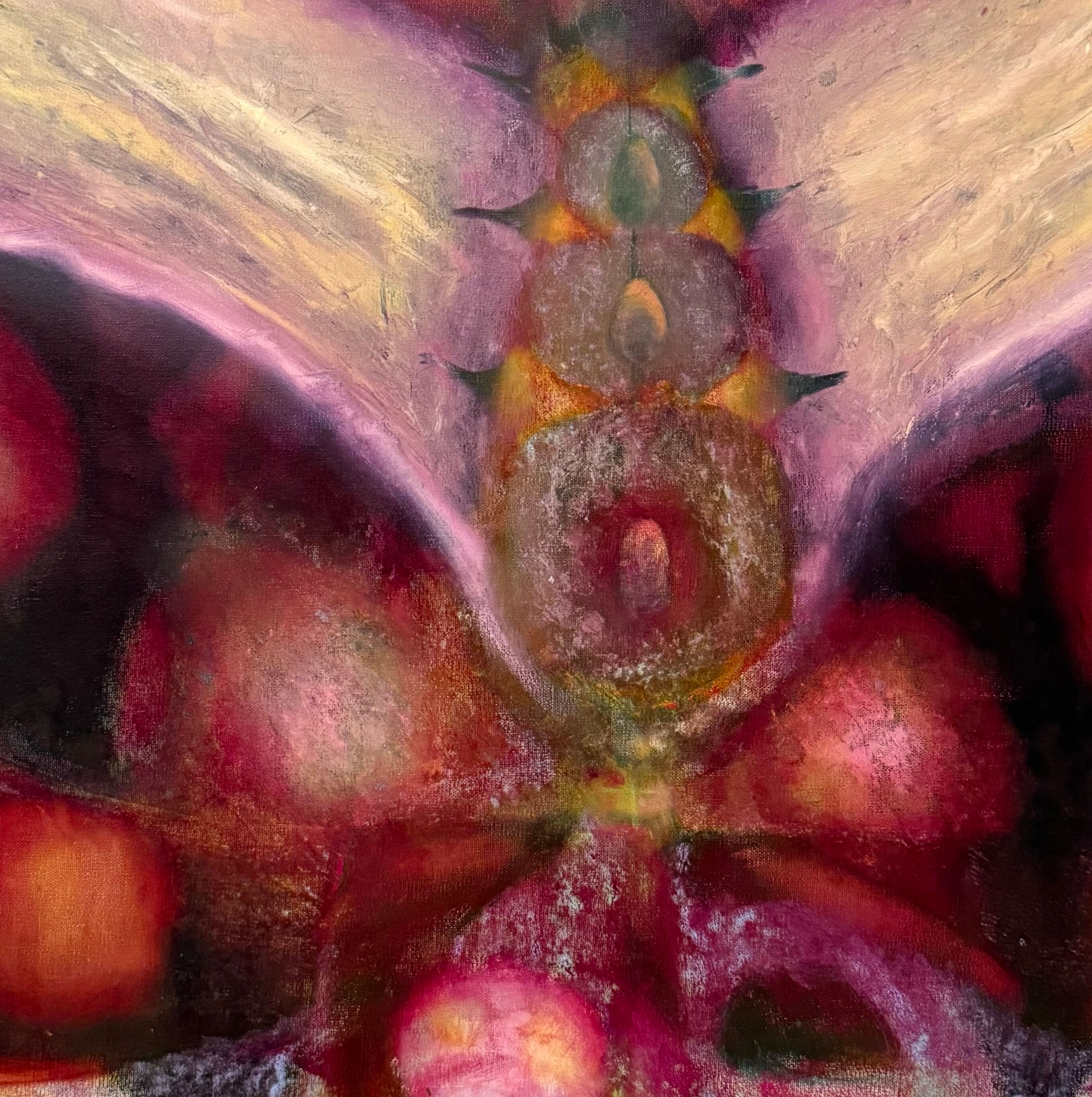 Ballantyne’s paintings emerge through an intuitive, layered process that privileges sensation over planning. Rich color, symbolic forms, and accumulated marks create surfaces where memory and perception intertwine. Each work becomes a quiet record of how past experiences continue to shape emotional and spiritual awareness in the present.