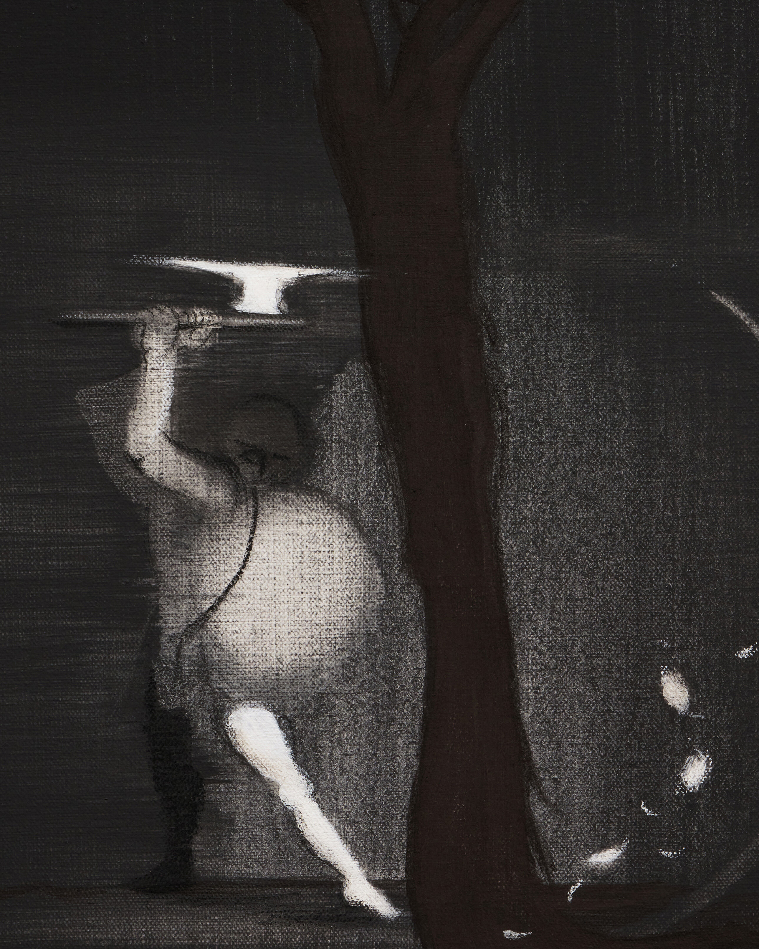 In the centuries before the widespread adoption of the Gregorian calendar, agrarian societies in Western Europe represented time as infused with the cycles of nature. Not unlike the modern Farmer’s Almanac or other global calendars based on solar and lunar movements, medieval farming calendars correlated times of the year with the sequence of labors necessary to raise and maintain crops and livestock. The calendars also served an invaluable psychosocial function, offering instruction for the timing of courtship, child-rearing, and other practices, and, in effect, creating a steadfast tie between the social order and the natural world. These agrarian calendars have become a new part of Cindy Ji Hye Kim’s visual vocabulary, extending the artist’s ongoing engagement with ancient myth, psychoanalysis, and archetypal iconographies. In her works for Platform, Kim explores ideas of collective action and the psychic reconnection of the human body as it moves through the first six months of the year. Across five paintings paintings, the artist depicts the labors and rituals identified with the Spring Equinox through the Autumn Equinox—roughly February through July—, reimagining the calendars’ diminutive peasant scenes in her shadowy grisaille palette.