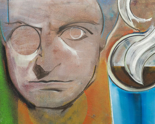 This painting depicts a night scene, where a panther with a friendly facial expression emerges from a crop of flowers. This work is part of a series by the artist that focuses on color, memory and personal mythology. The color blue, especially indigo, has historically been used in art to suggest the subconscious, as well as dream states and the mystical. Ruecker frequently uses a blue palette in his works that depict flowers. The resulting compositions invoke a sense of melancholy in viewers, as they contemplate the ephemeral nature of life.