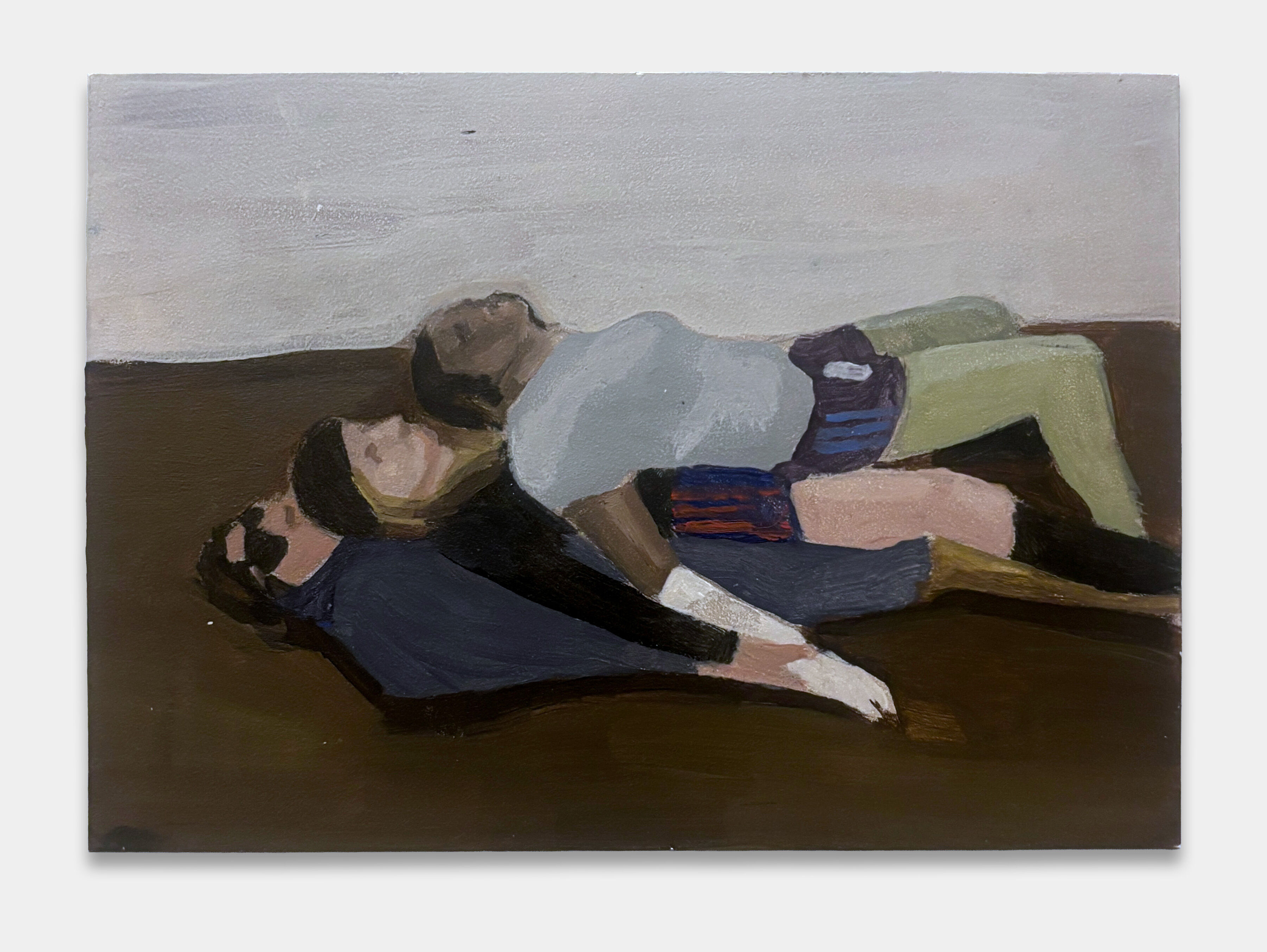 These paintings are part of a series by Eleanor Kaminski, based on darkroom prints of the artist and her friends piling on top of one another. Each painting builds on the last, keeping the same composition while adding one more person. The works have a straightforward, everyday quality, with a subtle sense of humor that comes from the repetition and accumulation.