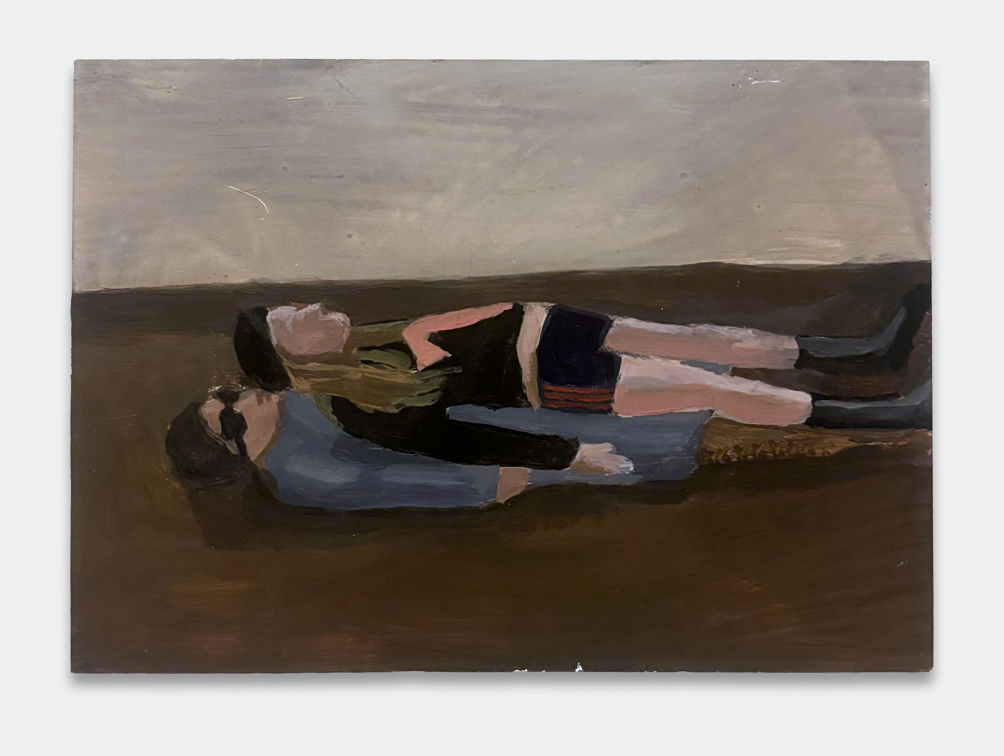 These paintings are part of a series by Eleanor Kaminski, based on darkroom prints of the artist and her friends piling on top of one another. Each painting builds on the last, keeping the same composition while adding one more person. The works have a straightforward, everyday quality, with a subtle sense of humor that comes from the repetition and accumulation.