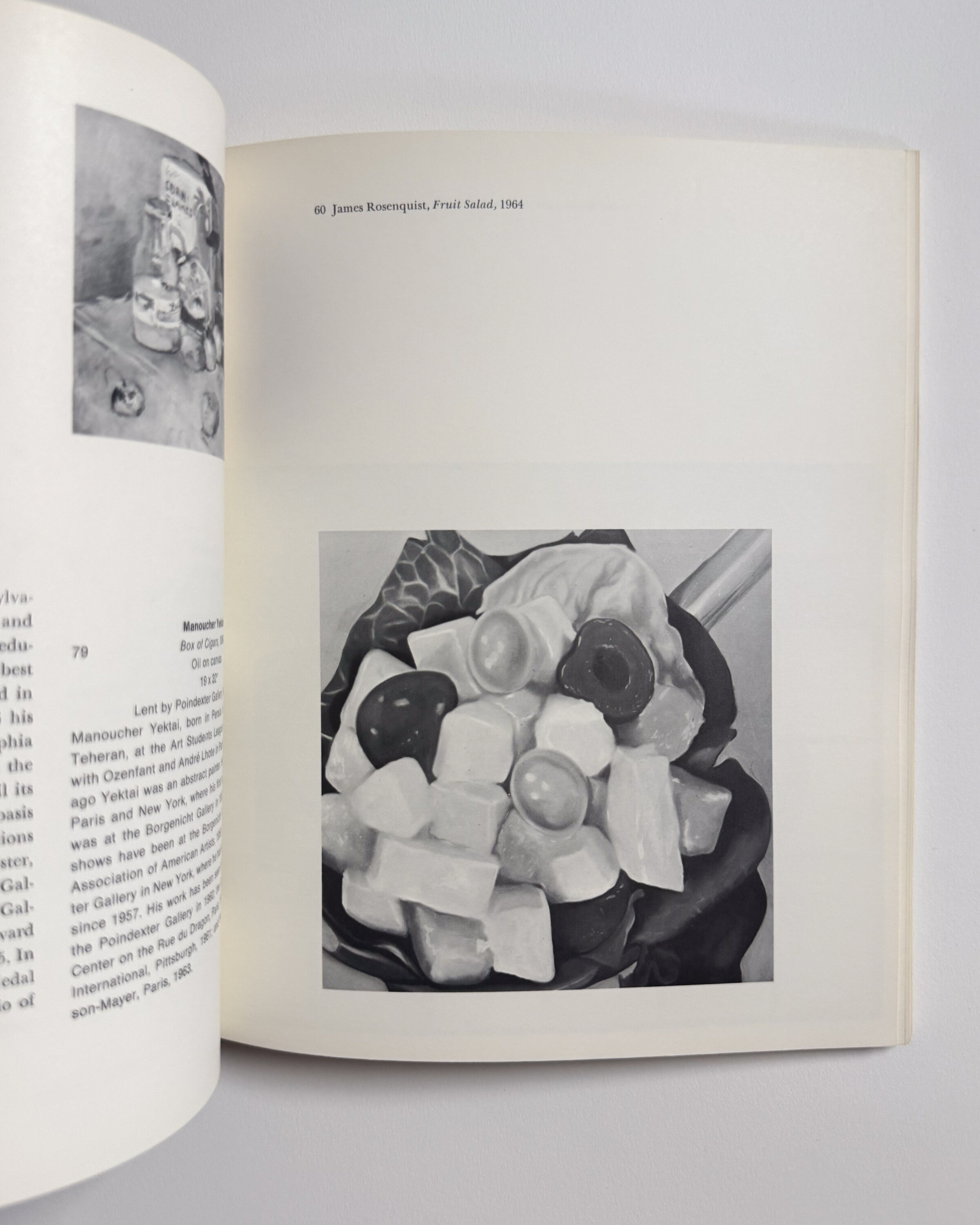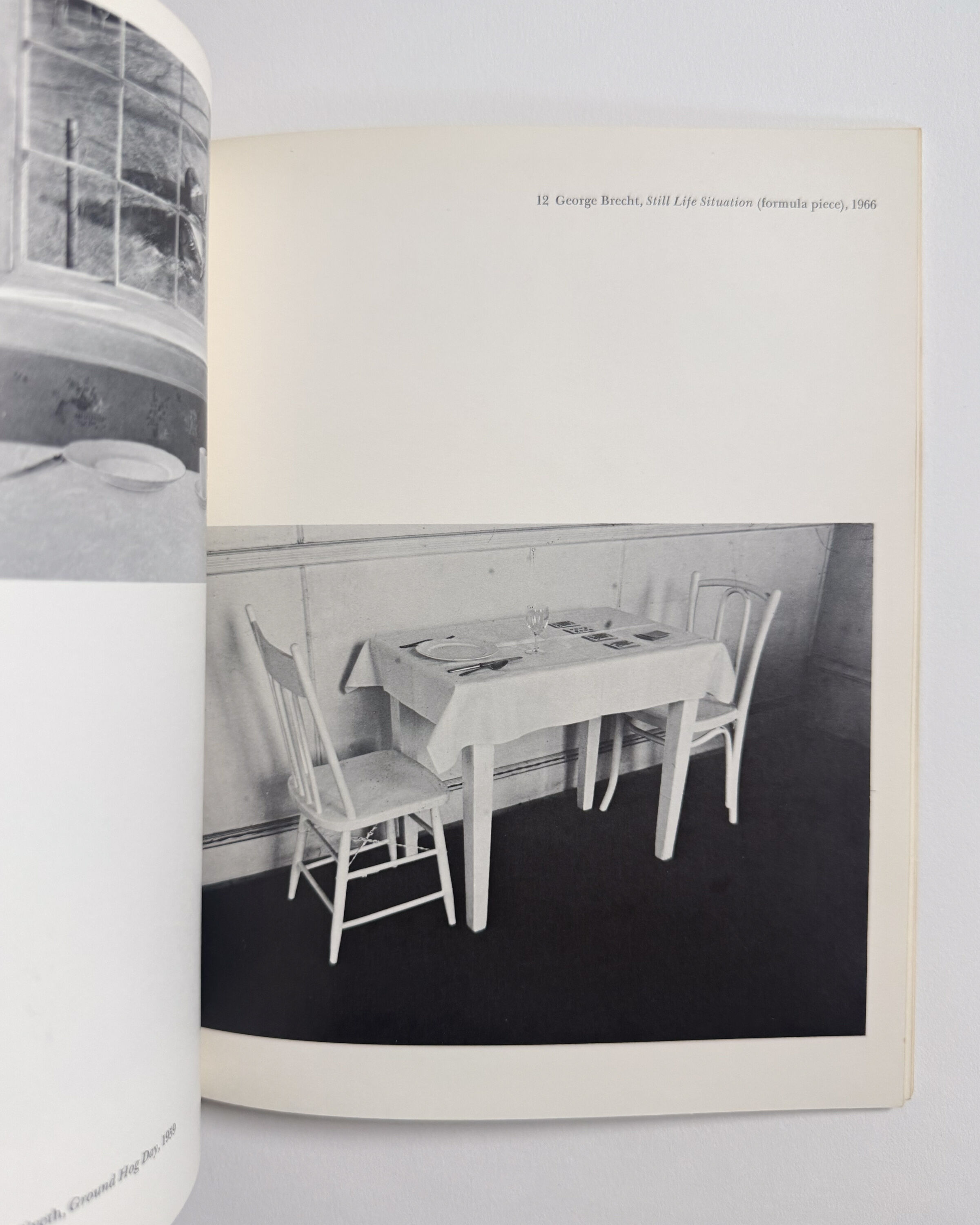 An exhibition book from a collection of more avant garde still lifes shown at the Rhode Island School of Design in 1966, including works from Katz, Oldenburg, Bourgoise, Lichtenstein, Warhol, Roth, Wesselman, and more. Dieter Roth was commissioned to design the cover as an edition, stamping, numbering, and initialing each, to make it unique. This copy numbered 169/1000. Only 780 of the edition were actually made. Slight foxing on pages, small tear to back cover, otherwise, excellent condition.