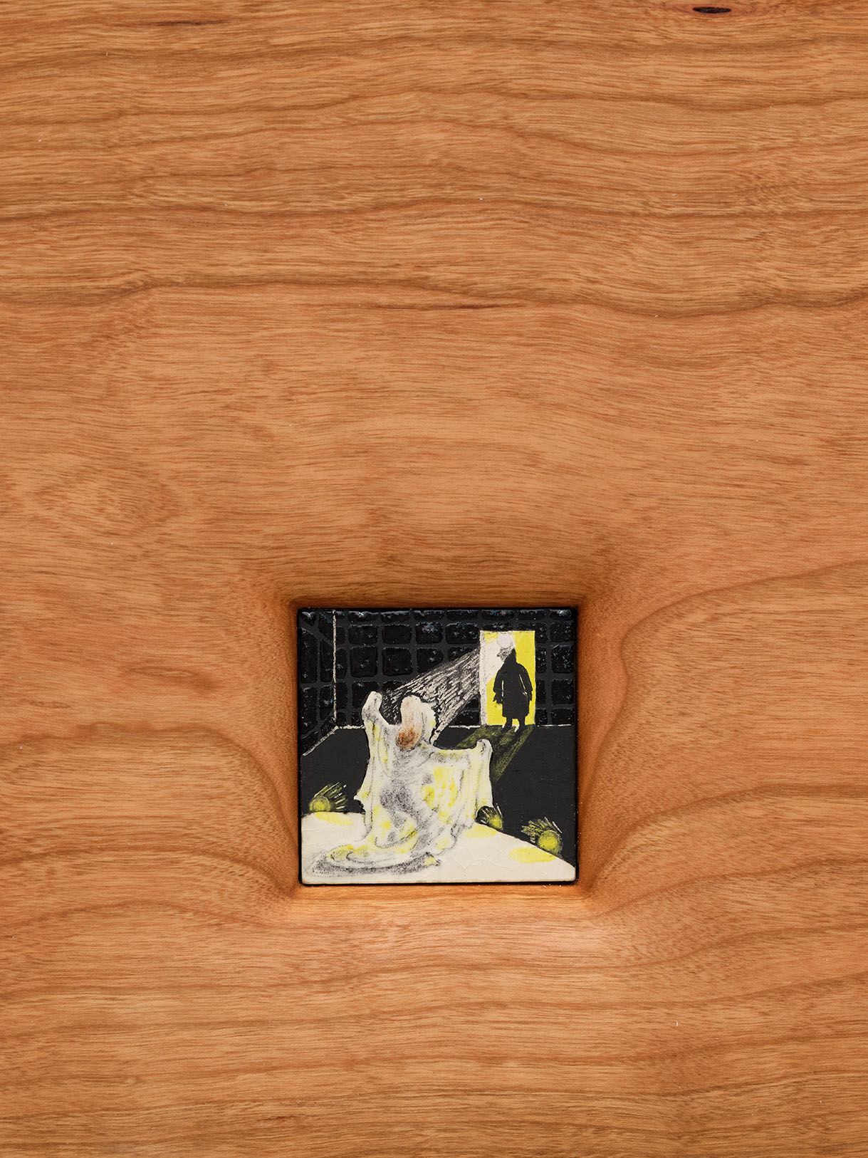 Each porcelain tile is embedded in a cherry surface, contorting the grain as an extension of the painted environment. The miniature scale insists upon private viewing: a visitor must do so by leaning close to see the salacious scenes as if through a keyhole in a locked door. Kettner’s characters oscillate between performing burlesque routines and shying away from meddlesome doctors and prying eyes.