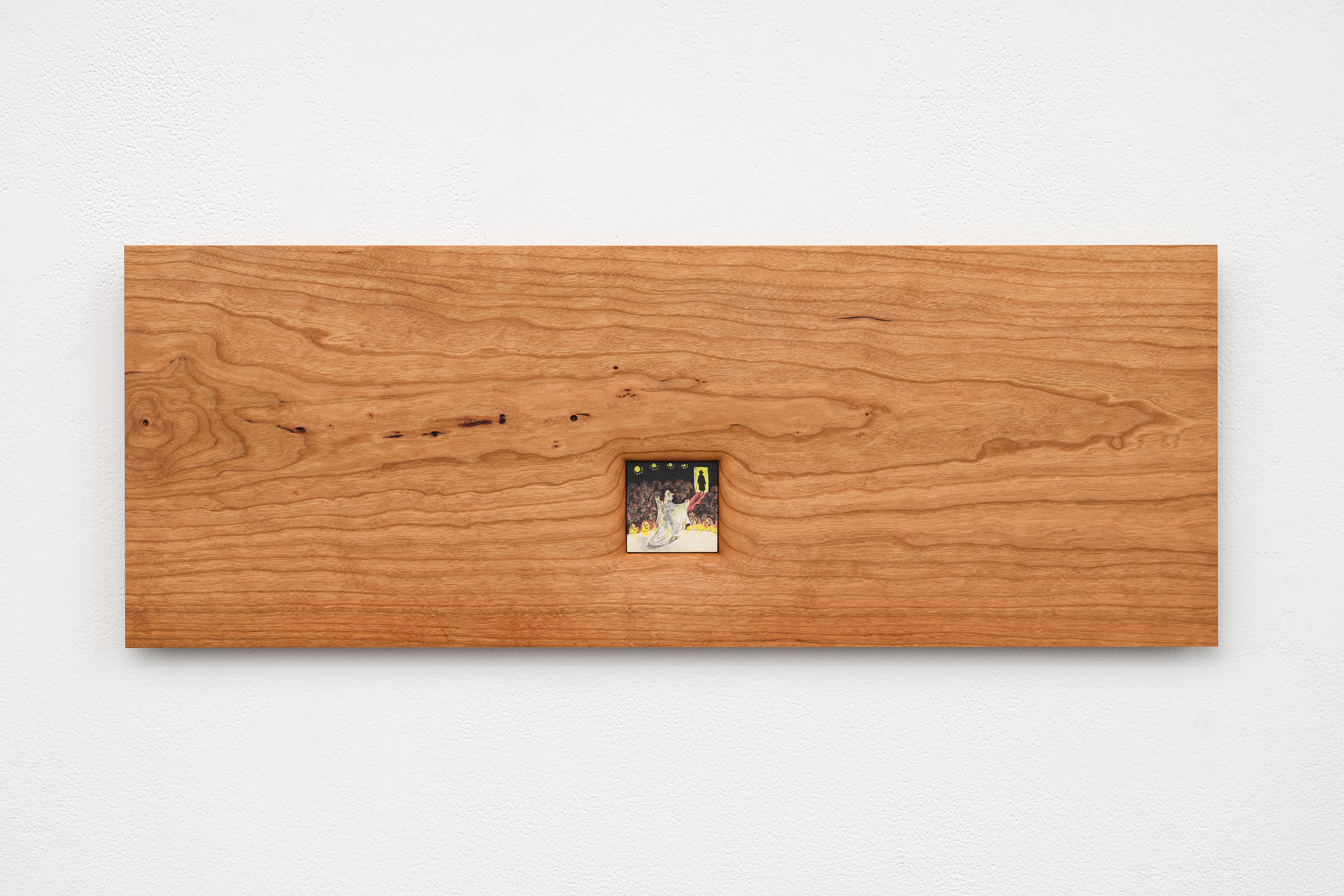 Each porcelain tile is embedded in a cherry surface, contorting the grain as an extension of the painted environment. The miniature scale insists upon private viewing: a visitor must do so by leaning close to see the salacious scenes as if through a keyhole in a locked door. Kettner’s characters oscillate between performing burlesque routines and shying away from meddlesome doctors and prying eyes.