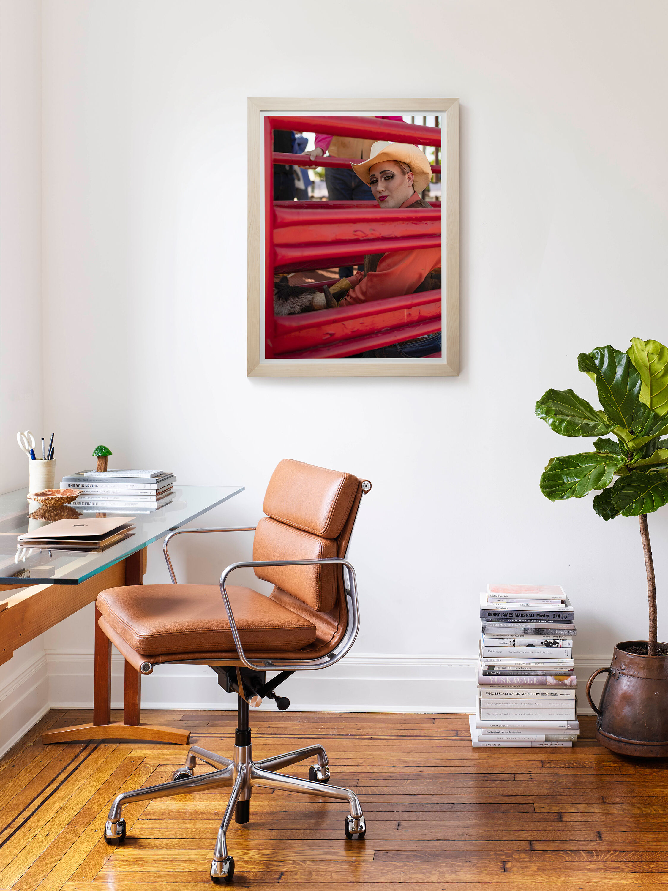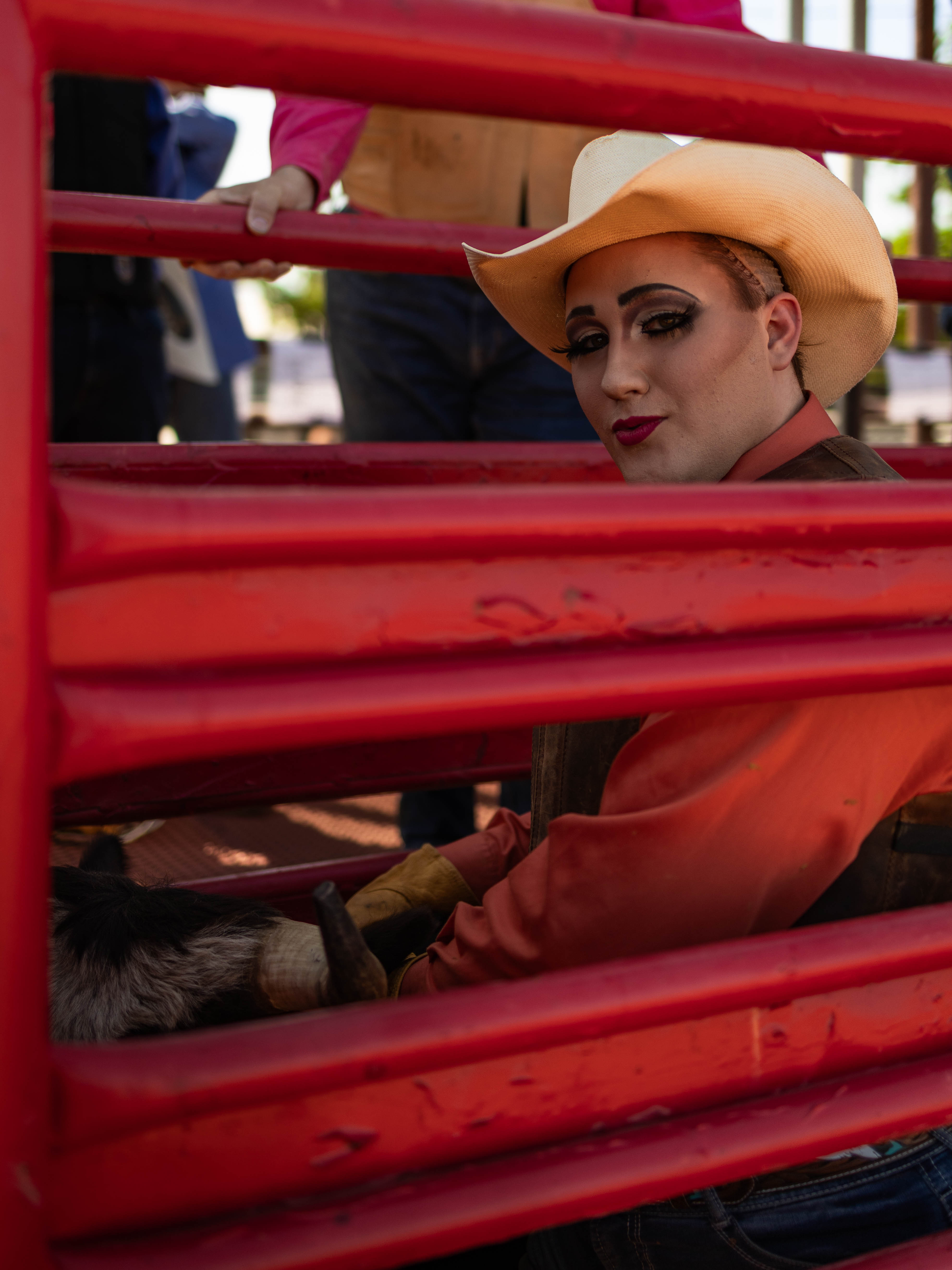 Evita is a young queen I happened to meet during her year competing for Rookie of the Year and Miss IGRA. She traveled from the Atlantic States Gay Rodeo Association throughout the year to compete in full drag during the rodeo day before attending the royalty events the night of and perform lipsyncs. In this image, she's preparing for her chute dogging run; you'll notice she is in full mug, lashes and all, with a wig cap underneath a cowboy hat. Our rodeo requires a dress code for certain events, including button-up shirts, cowboy boots and cowboy hats. Because of this rule, Evita would frequently take her wig off while competing and only wear it during events that had no dress code. I really love the overuse of the color red in this photo, as well as the expression she's giving the camera.