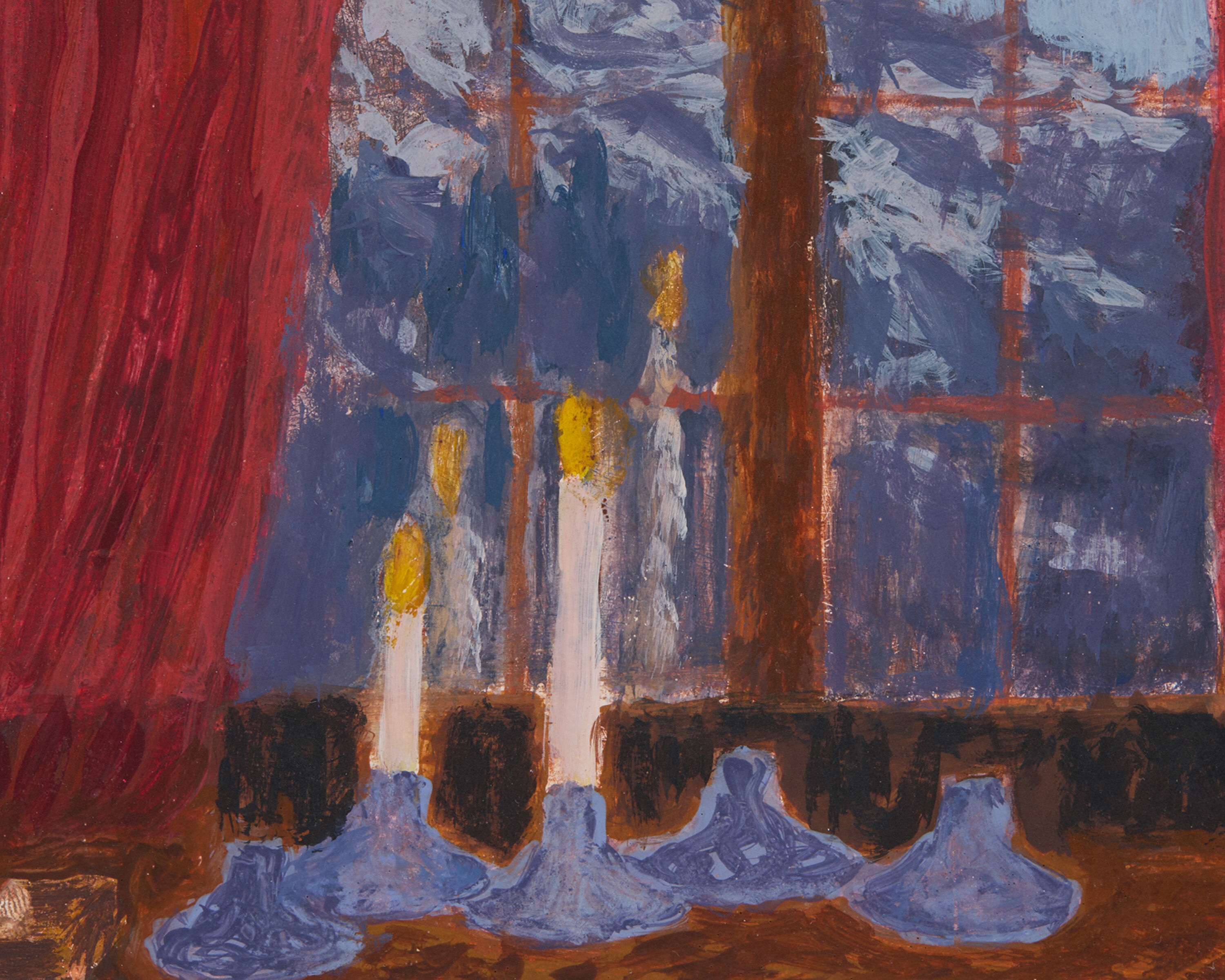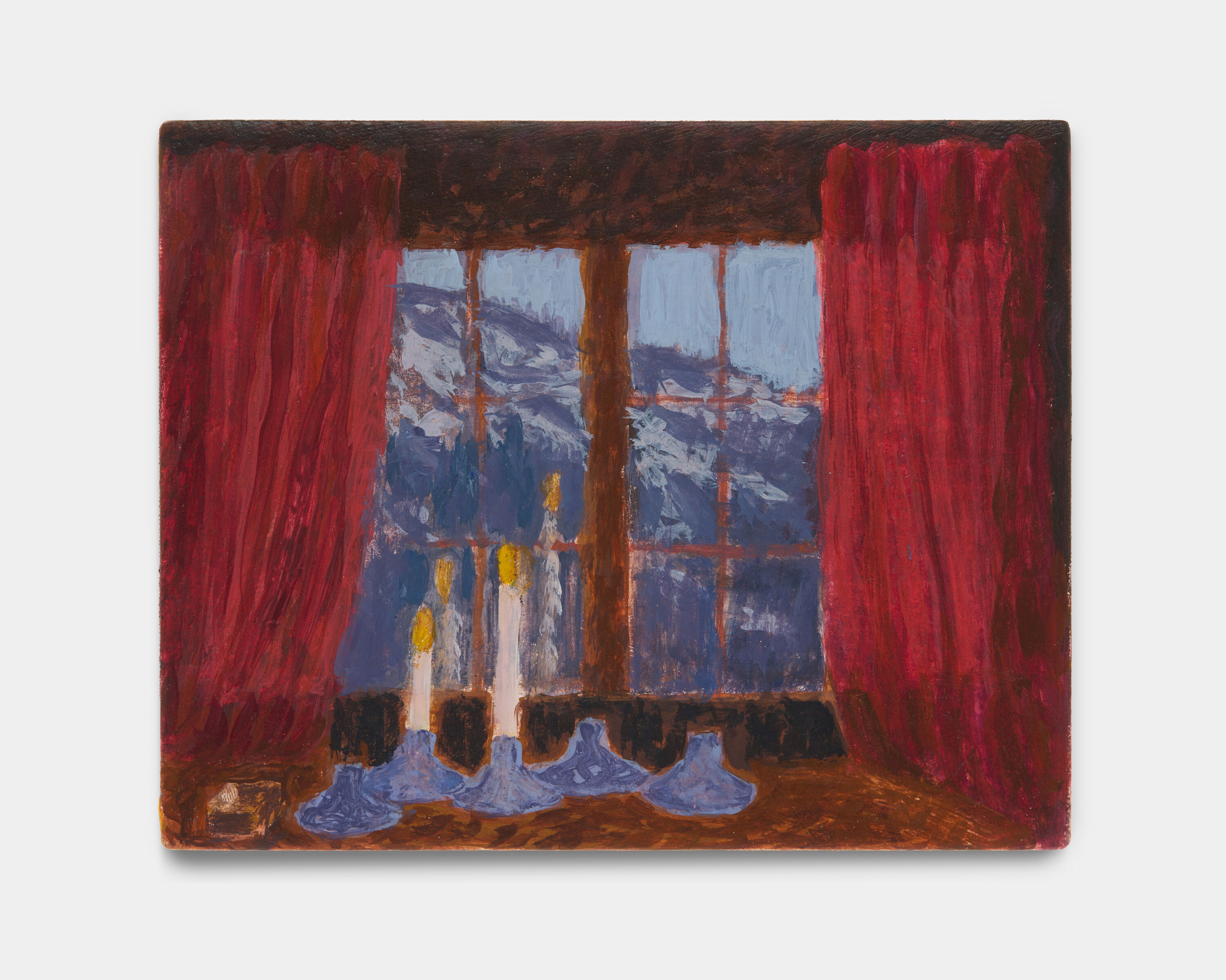 Midnight at Høgabu depicts her sleeping child in a mountain lodge in western Norway, where the faint glow of a snow-covered cabin in the distance evokes the nostalgia of warmth and shelter. In Morild, a Danish word meaning “glowing sea,” a lone swimmer drifts through a scintillating body of water, suspended between darkness and radiance. Beverin opens onto a candlelit window view of the Swiss Alps, merging a domestic interior with the grandeur of the mountains beyond. Through these intimate, layered paintings, Rathgeb transforms quiet moments into meditations on place and the attentive care embedded in observation.