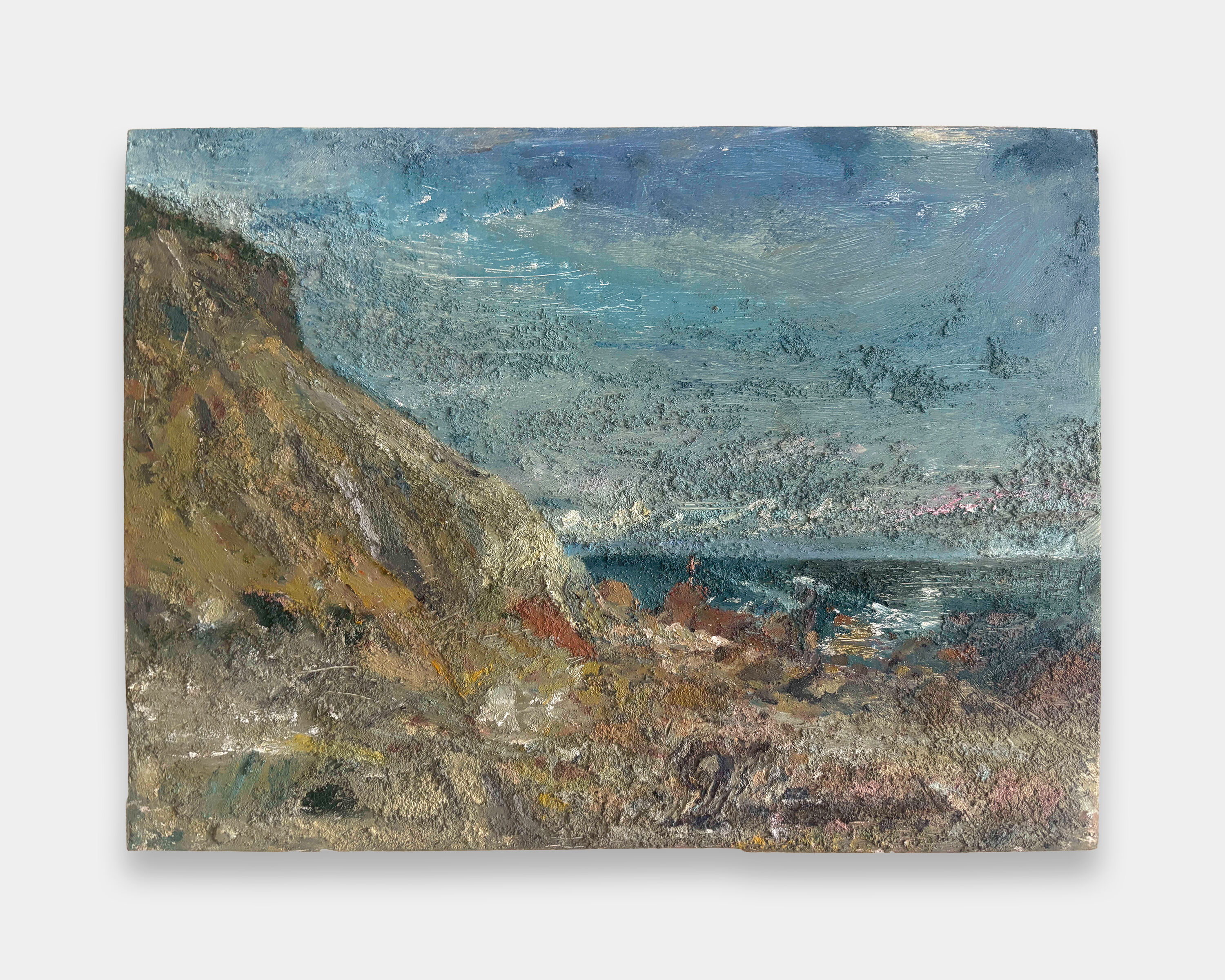 This painting was created during a week in September spent on the beach. It depicts the bluffs of Block Island, Rhode Island, a recurring subject in the artist’s work, and is part of a growing collection of landscape sketches made on the shore. Executed on wood, the painting incorporates sand and presents the profile of a bluff noticeably altered since the previous year. The site is one the artist has observed at every stage of life during family trips. At the painting’s center, a small boy stands on the layered rocks. Sand is integrated into the oil paint both intentionally and by chance, adding texture and a sense of immediacy to the work.