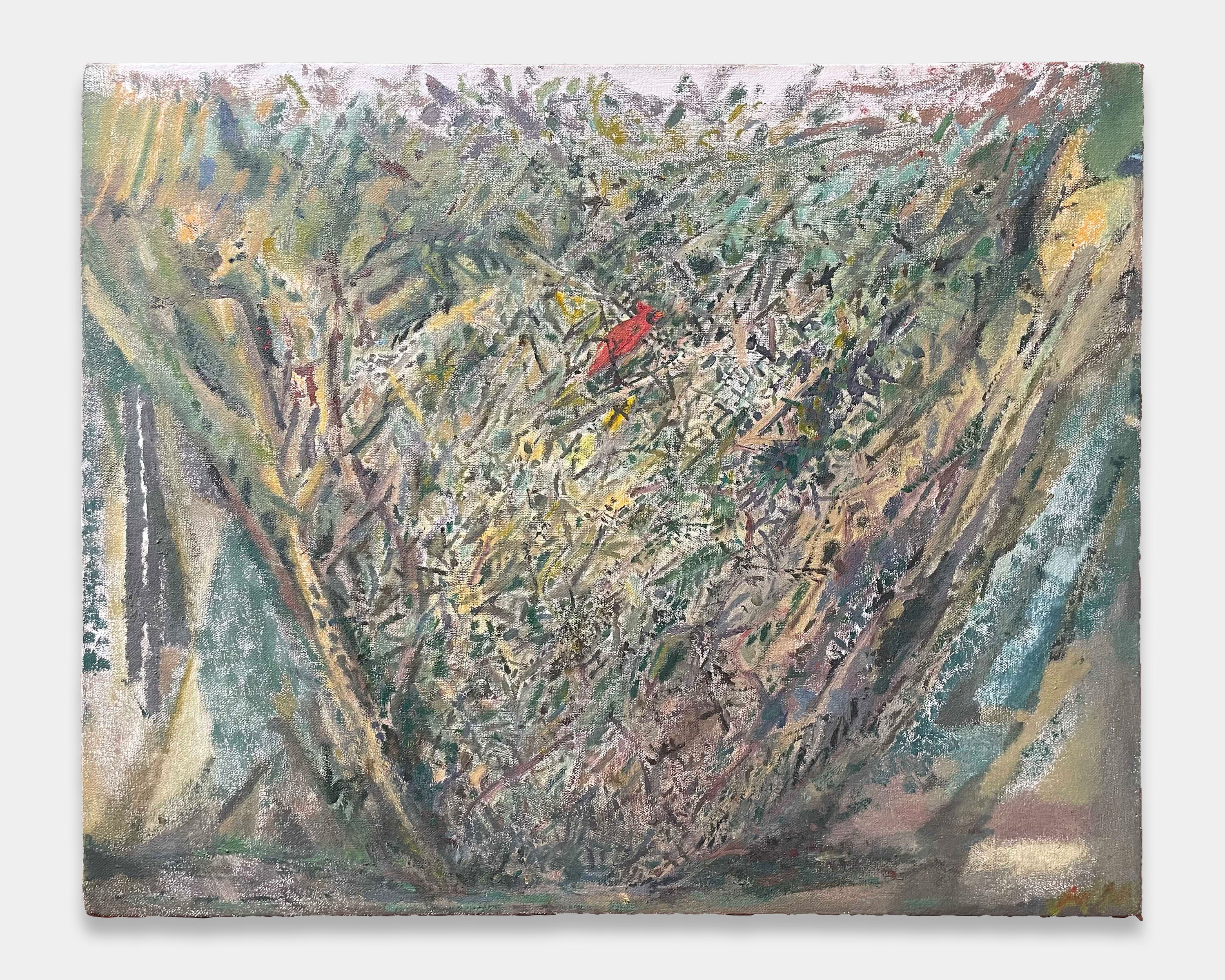 This painting depicts a male cardinal amidst the bramble of a ravine and is part of a series exploring seasonal moments observed on walks. The image of the cardinal in winter was revisited in the studio and developed into a larger work, reflecting Murphy’s engagement with personal, noteworthy experiences in nature.