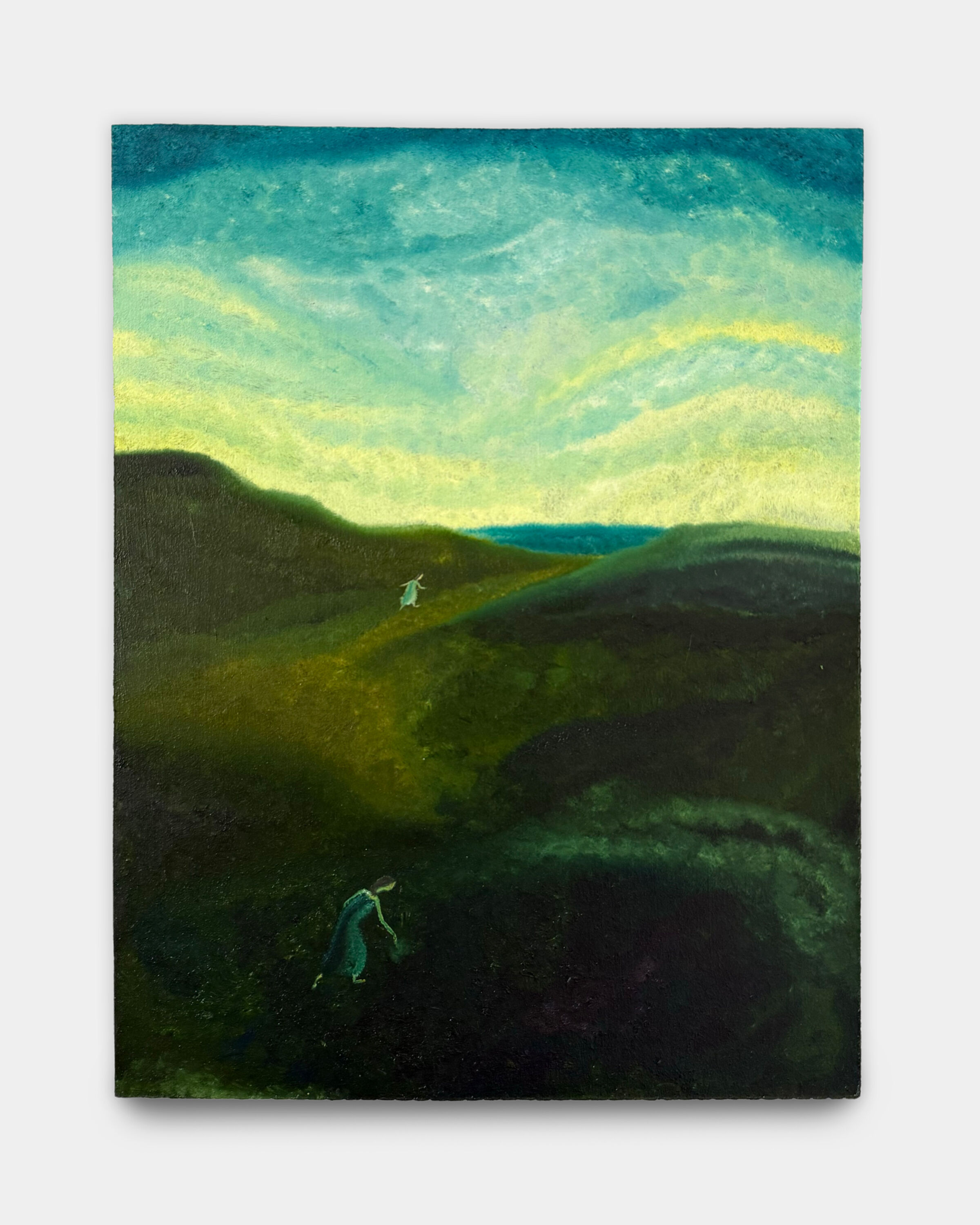 Ish Lipman's expressive oil paintings of sky, sea, and rolling hills populated by tiny figures investigate the complexities of the sublime in relationship to the contemporary landscape. Drawing upon our growing alienation from the natural world, Lipman’s paintings seek to explore this rift, aiming to examine the various anxieties and reveries that emerge from healing this inner divide. The paintings emerging from these investigations have a similar existence to those moments between sleeping and waking, where the world is colored with the aftertaste of a vivid dream.