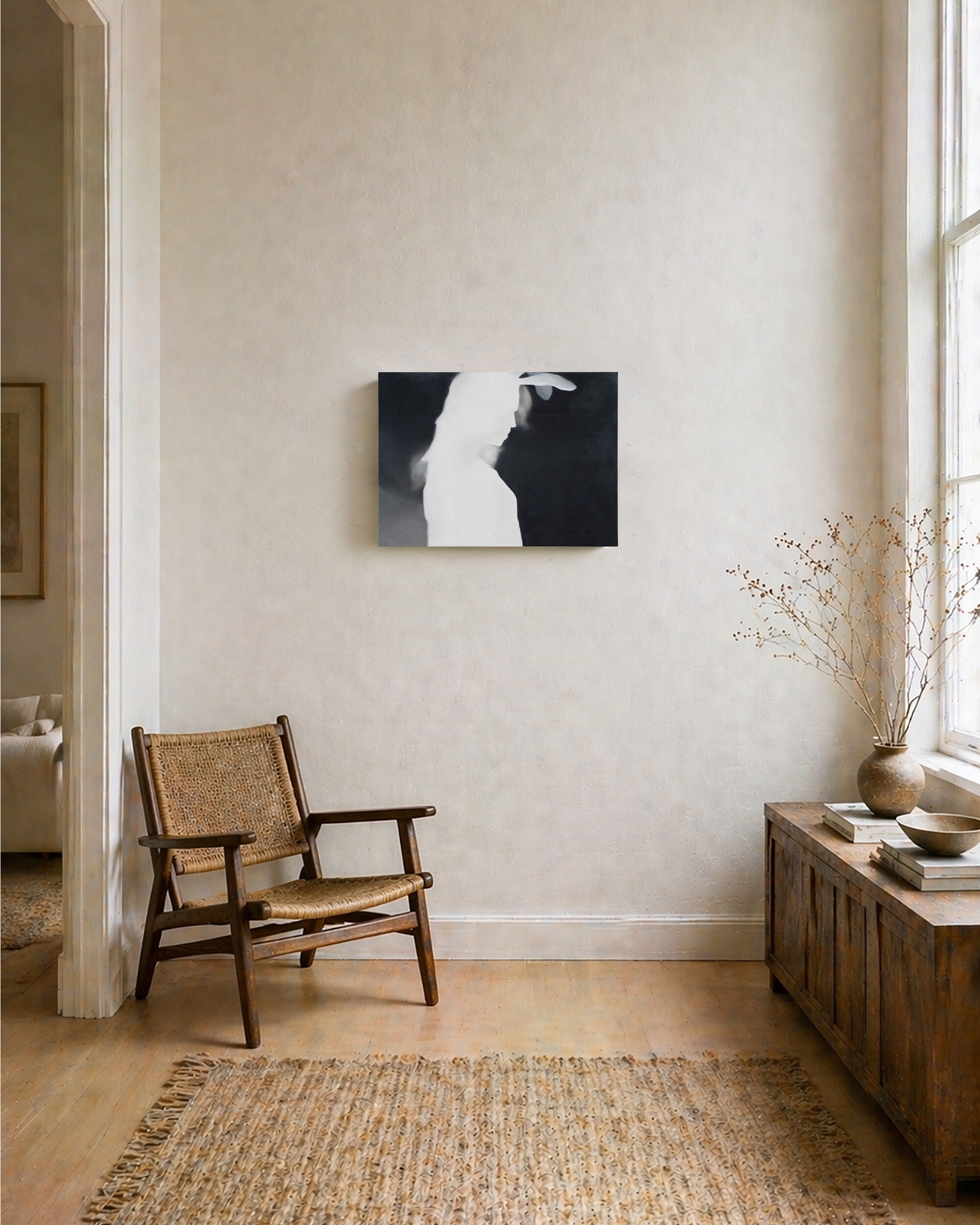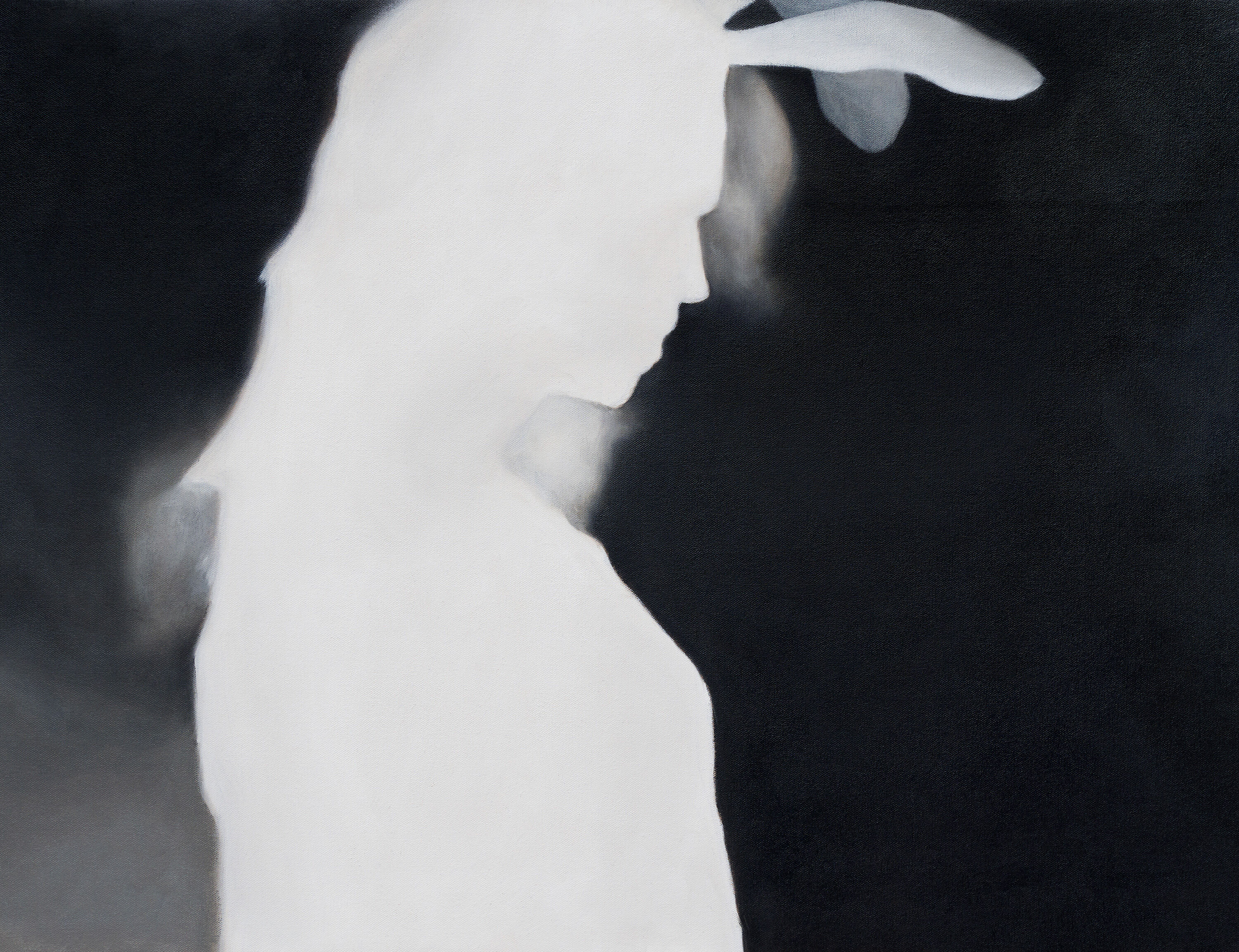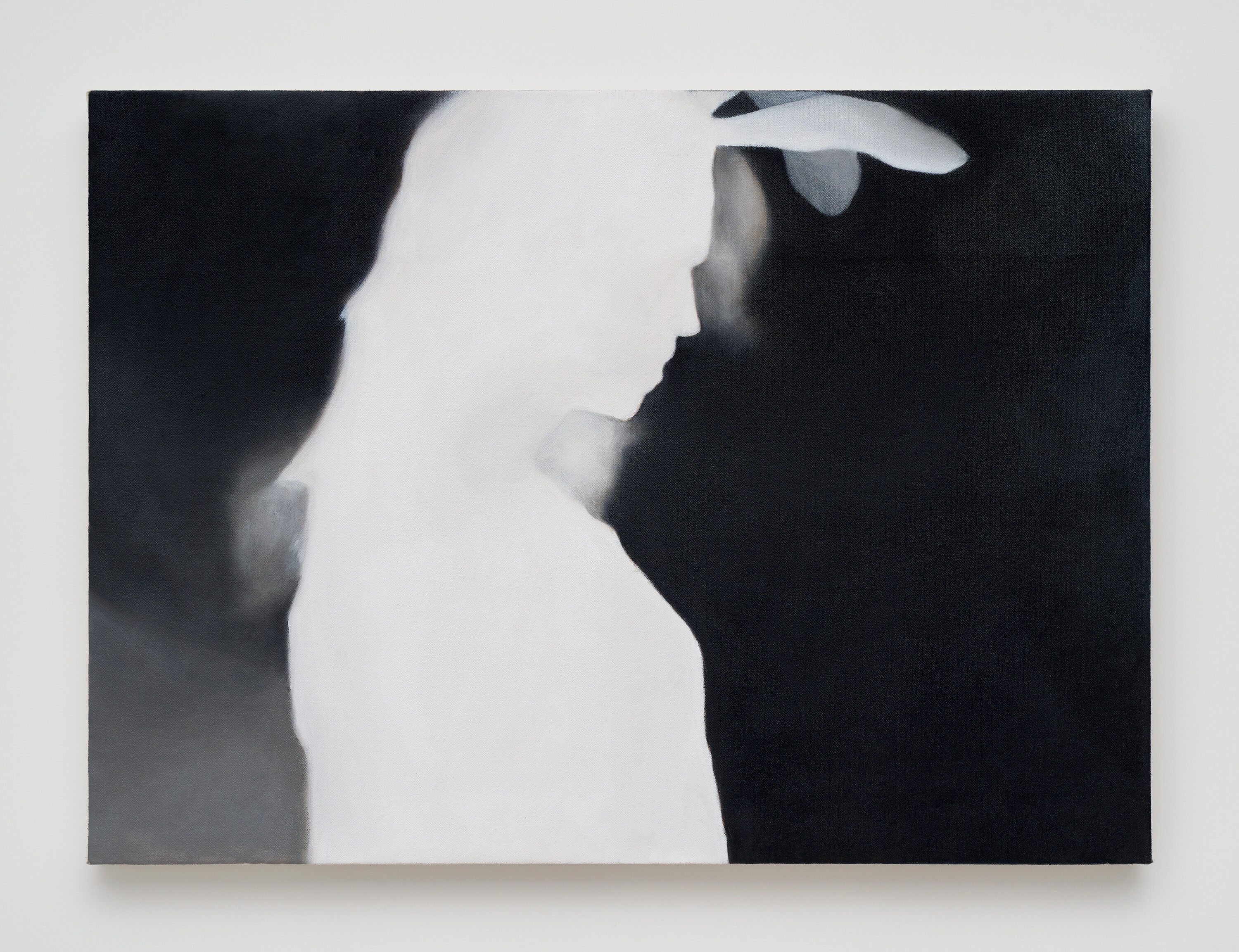 Jealousy (or Melancholy) is a painting featuring a feminized outline, an inverted, depth-mapped image of a woman wearing bunny ears. Taking its title from an Edvard Munch painting with the same name, the work can speak to themes of humor and absurdity in uncertain times, or point to the potential for the distancing of personhood in a society in need of escape.
