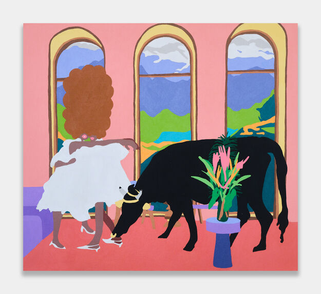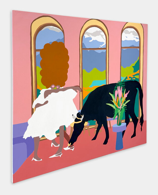 In this painting, jewel-toned oysters and prawns are nestled within a lush and gestural background that is characteristic of the artist’s work. Messer presents viewers with an otherworldly seafood tower through fluid strokes of royal blue and tangerine.