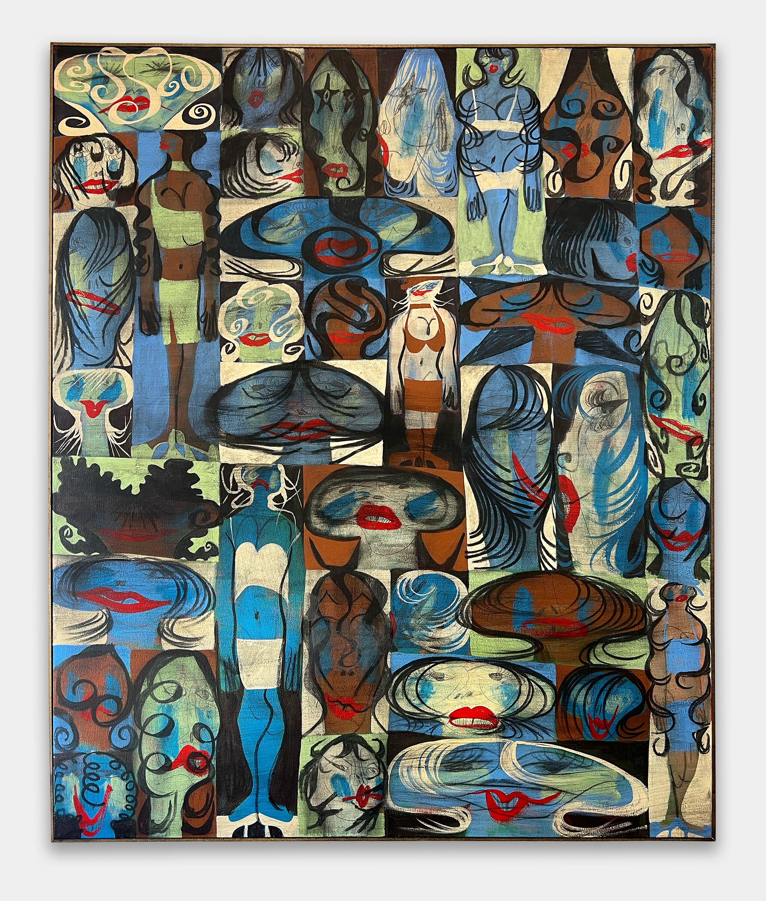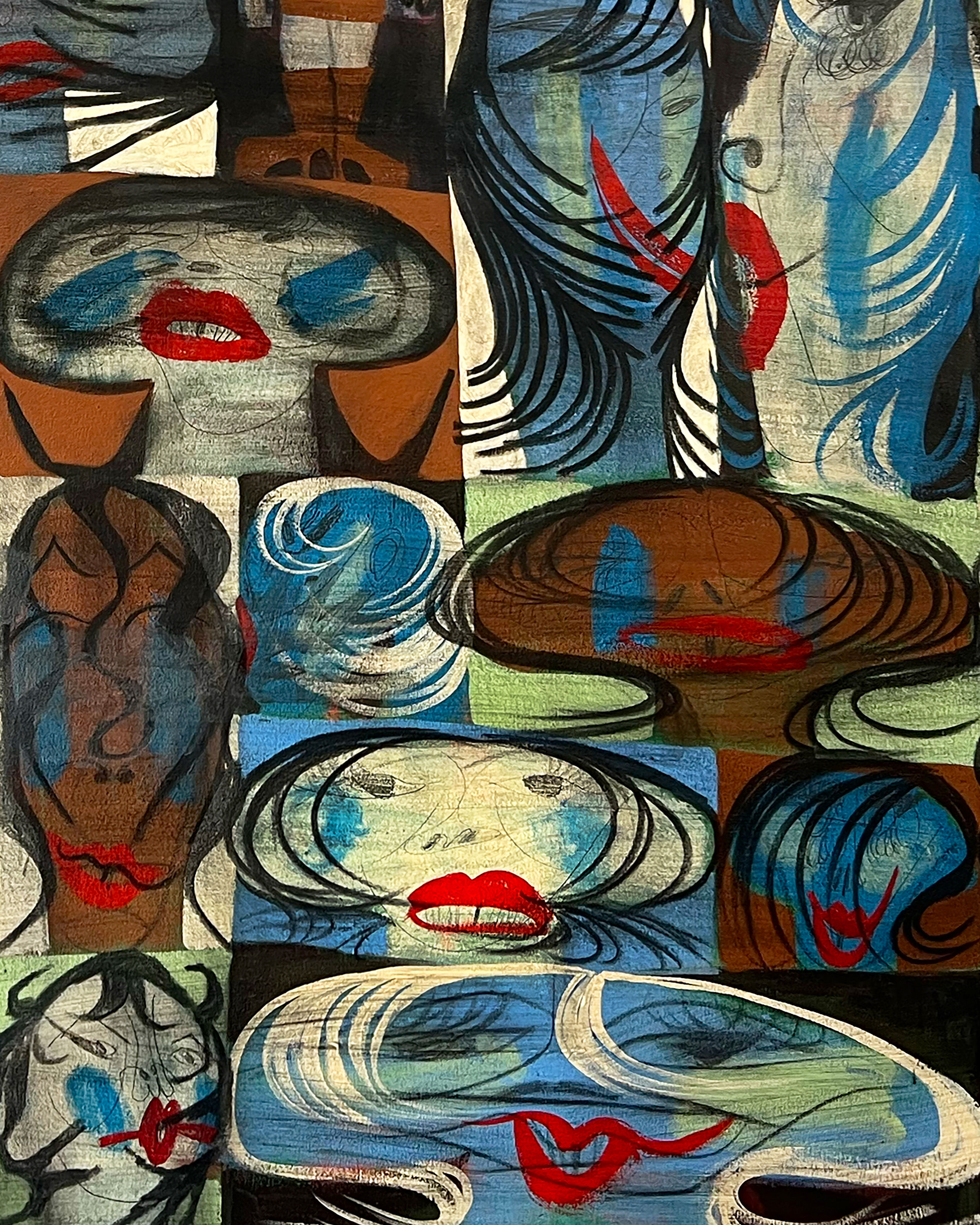 Kevin Sabo (b. 1992) is an American painter working in Richmond, VA. His colorful, character-driven works use exaggerated proportions and distinct fashion choices to define his figures. Men in suits serve as symbols of masculine tropes in American culture—nodding to the corporate world and the twisted nature of manhood. In contrast, the feminine figures embody playful heroines, often seen stomping on these suited men with high heels, playfully subverting traditional gender dynamics.