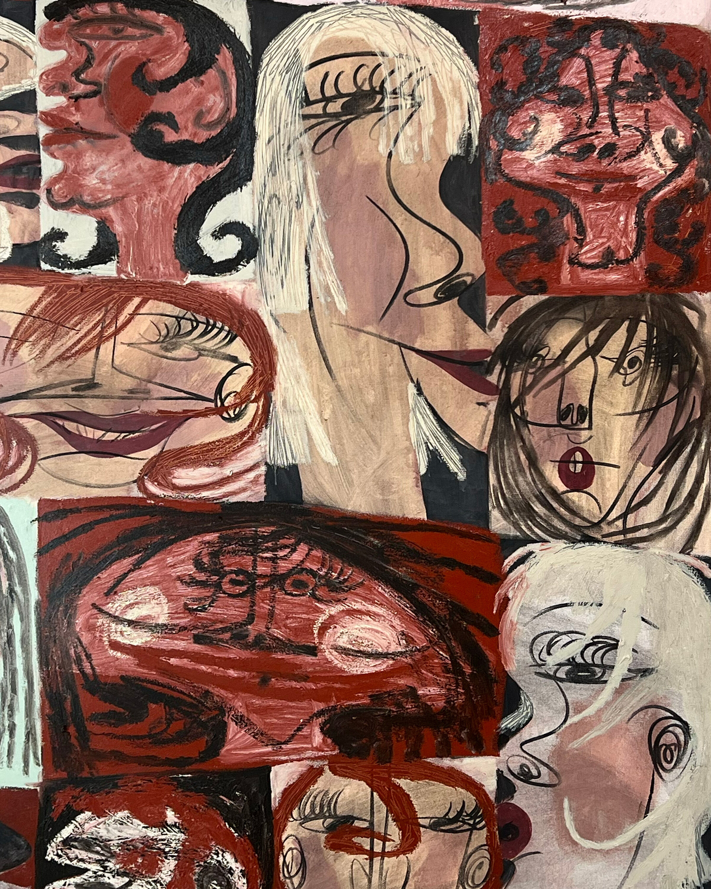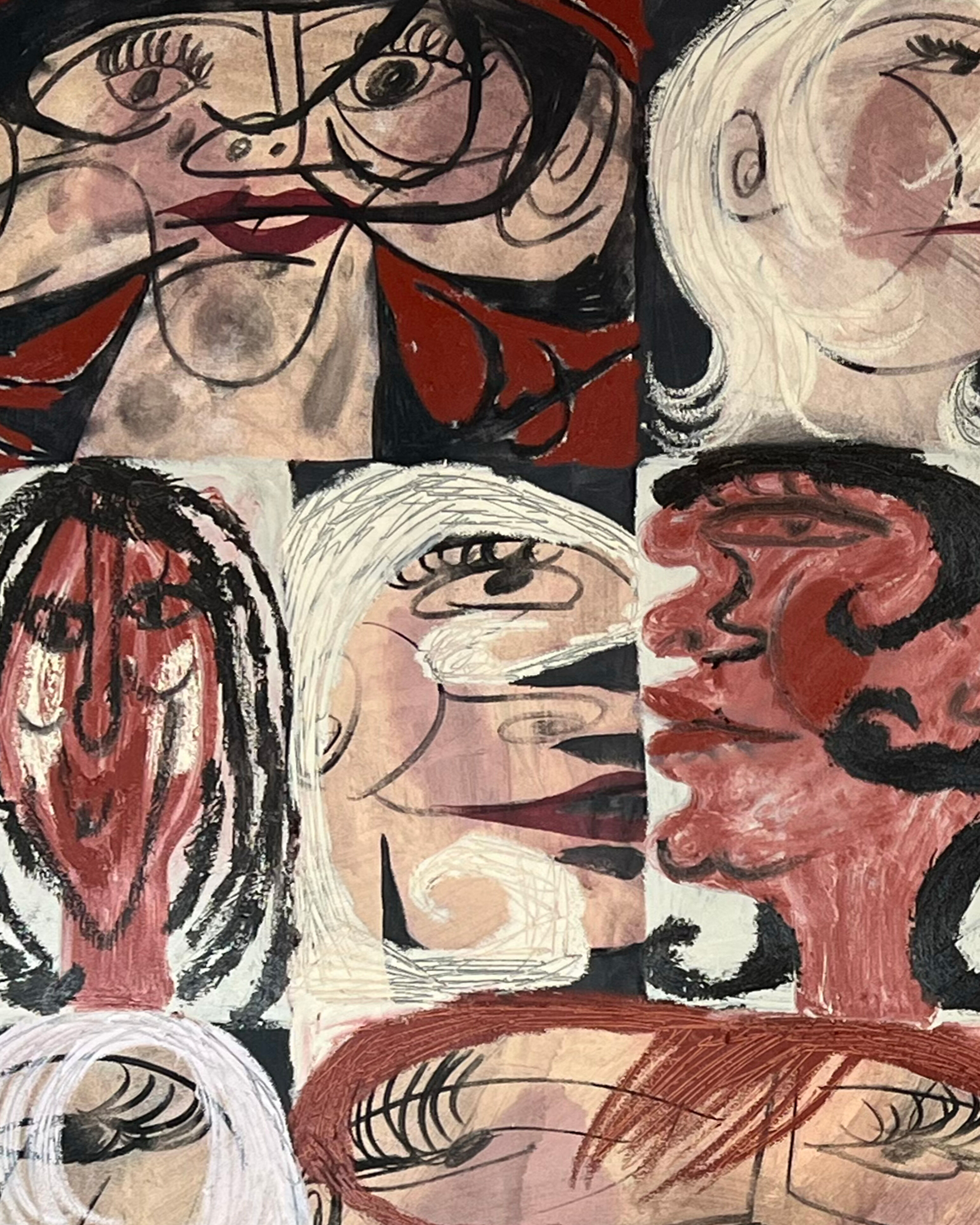Kevin Sabo (b. 1992) is an American painter working in Richmond, VA. His colorful, character-driven works use exaggerated proportions and distinct fashion choices to define his figures. Men in suits serve as symbols of masculine tropes in American culture—nodding to the corporate world and the twisted nature of manhood. In contrast, the feminine figures embody playful heroines, often seen stomping on these suited men with high heels, playfully subverting traditional gender dynamics.
