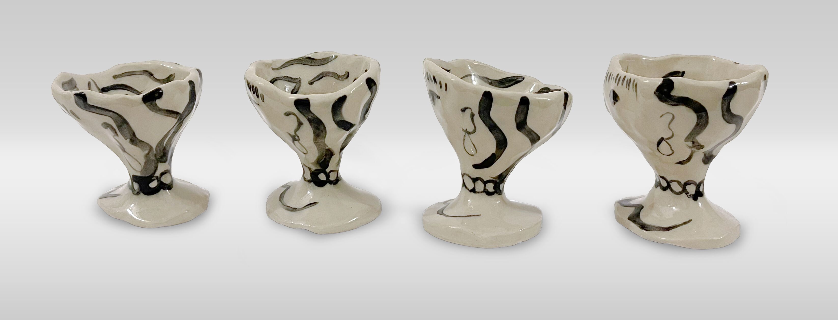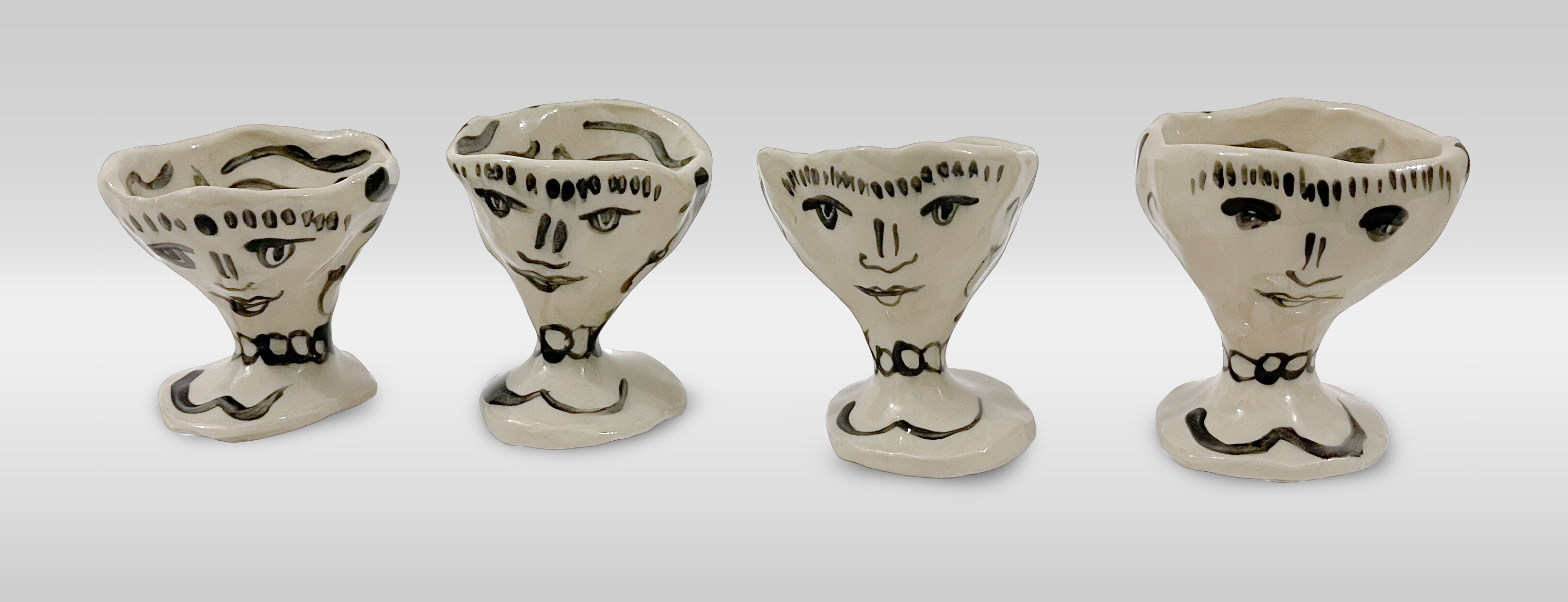 “Goddess goblets” were the first ceramics Maya Strauss created—an exploration of how to make a cup with a distinctive style that gestures toward the past. Her approach draws heavily from ancient representations of magical or powerful feminine figures, including the Venus of Willendorf, Baubo, Sheela na gig, and Cycladic figures. Each goblet is an individual with her own distinctive smirk and a head full of swirling water and swimming fish.