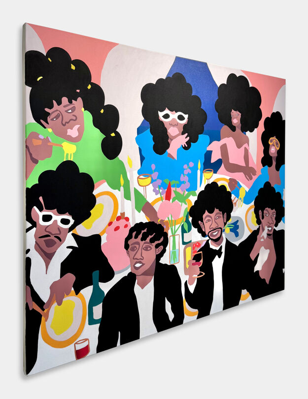 Deeply influenced by the women in her family, Mia’s multidisciplinary approach extends into textile design, where patterns from her paintings are translated into wearable forms. In 2022, she collaborated with Chance the Rapper on YAH Know, exhibited at the Los Angeles County Museum of Art (LACMA), and was selected for Jordan Brand’s Artist Series. She has also partnered with Urban Outfitters on a genderless apparel collection.