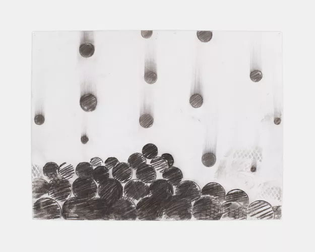 The peach, perhaps Payano’s most iconic referent, is a prime example of his visual language. The artist was inspired to fuse mouths onto peaches from multiple sources—drawing inspiration from both the English phrase “you are such a peach” and the magical peach orchards in Chinese culture. In Payano’s mind, mouthed peaches became “single-celled” humans. The mouths provide an individuality to the peaches. Likewise, the relatively simple peach shape facilitates their inclusion into more complex scenarios and metaphors.