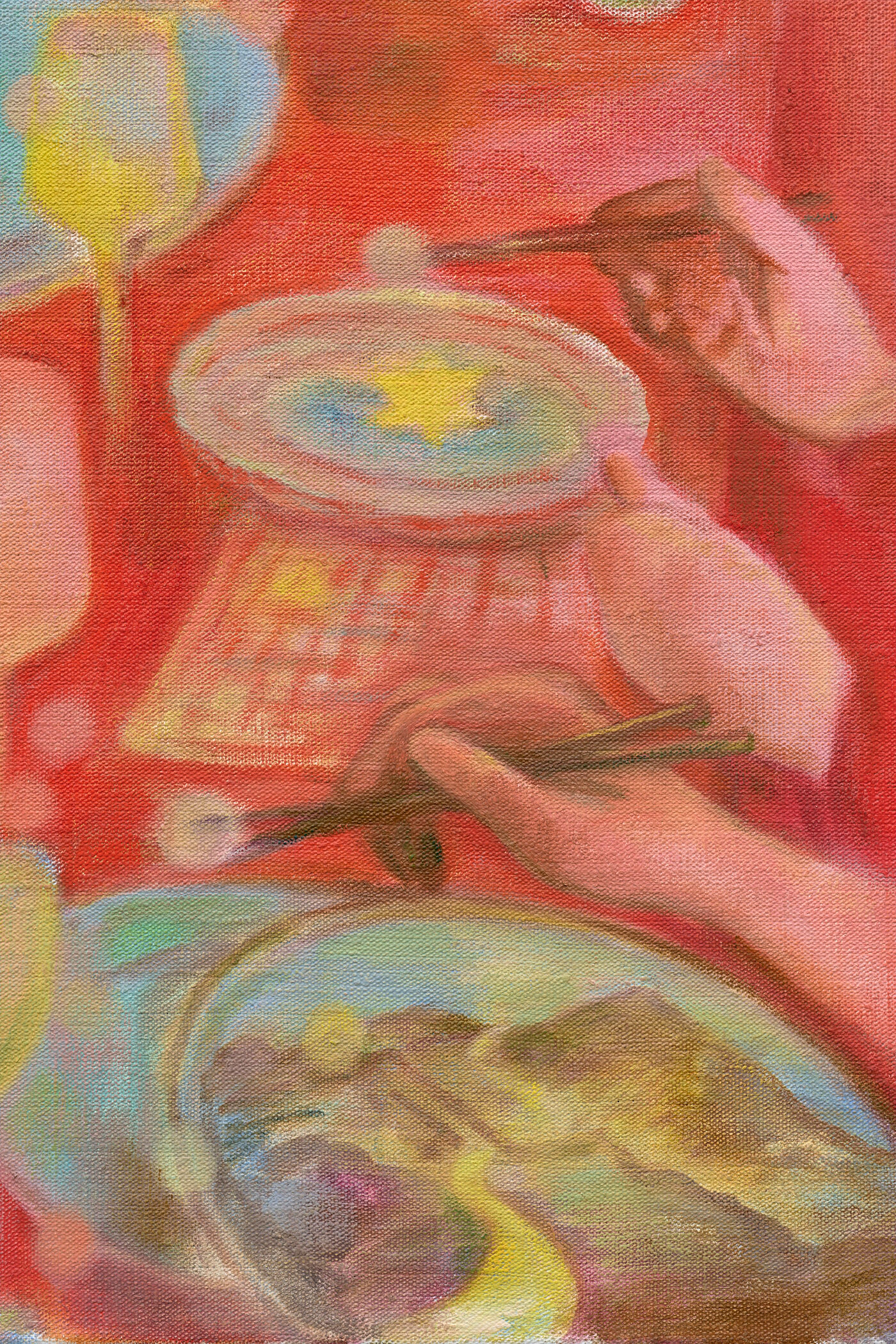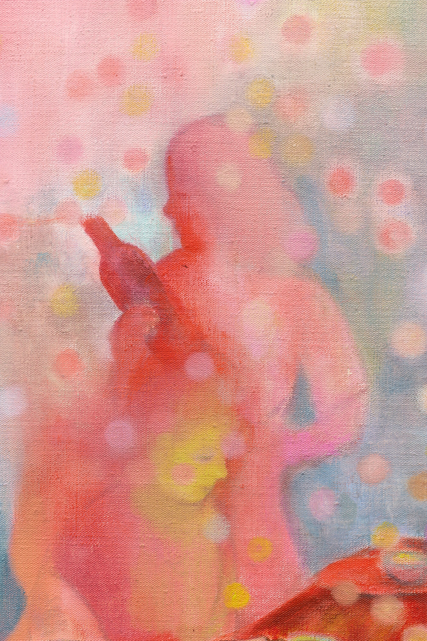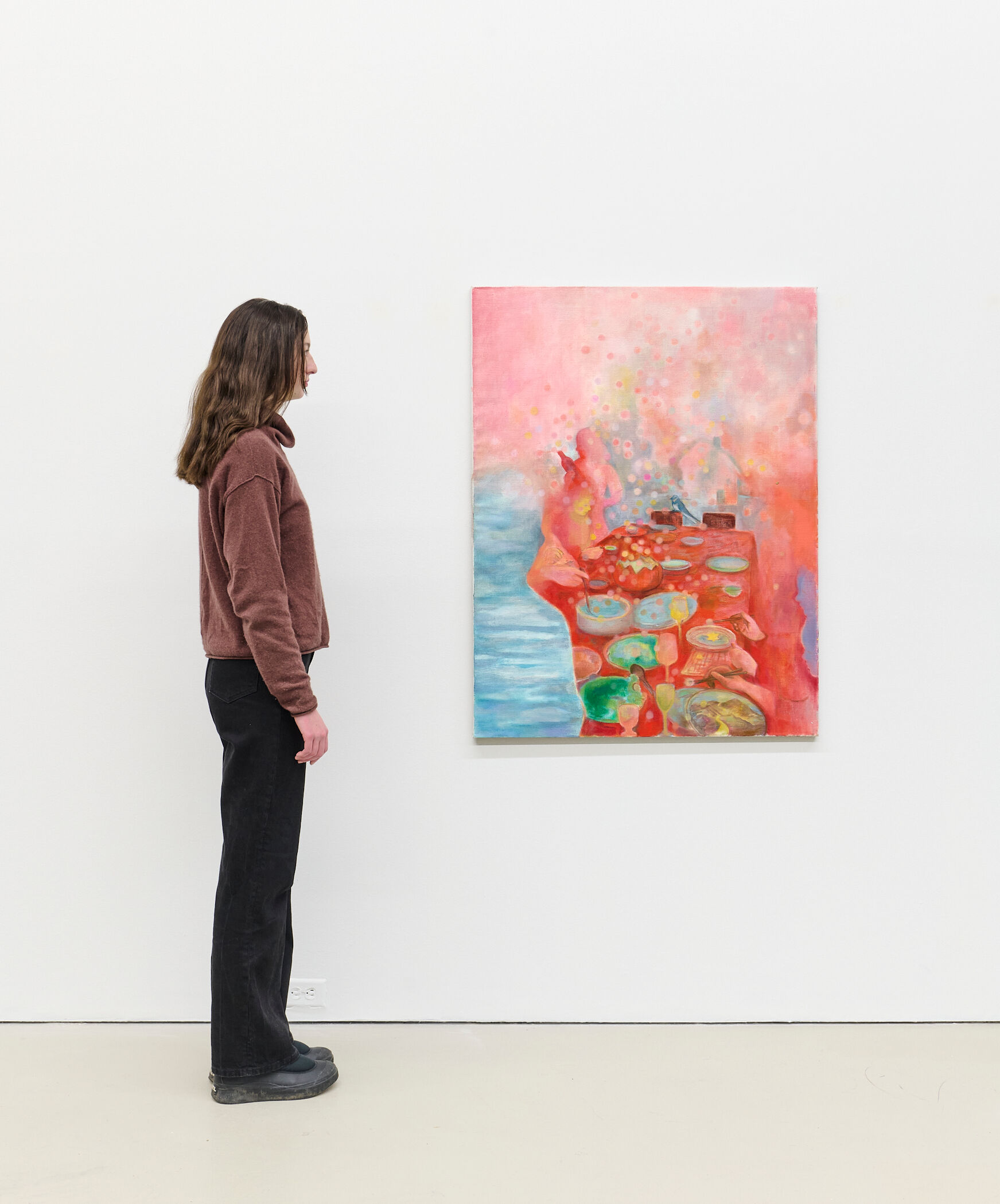 In “Farewell”, ghostly pastel figures meld together at a dining table, diffusing into a confettied backdrop that merges into the outside world. A bluebird rests upon a chair at the end of the table, quietly observing the function. In the foreground, a silhouette is filled emerges with a cloud-like pattern — a surrealist spectre that hovers in anticipation above the tablescape.
