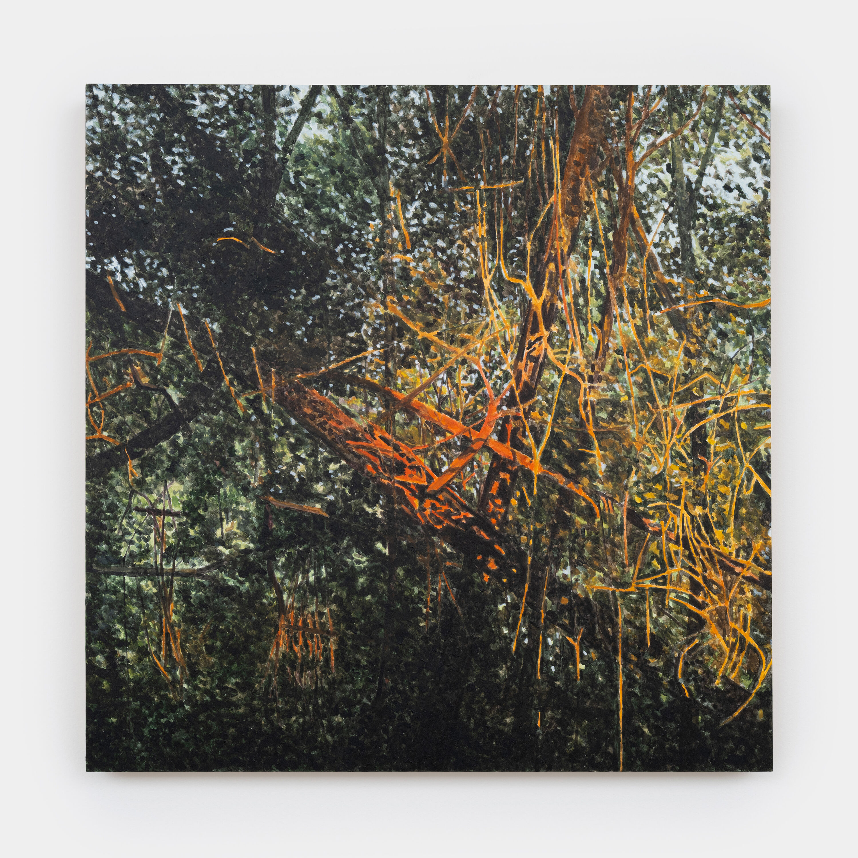 This image is based on a photograph the artist took from the side of a car on Fishers Island, New York. Made at sunset on a clear summer day, the work captures the orange light striking the west-facing trees.