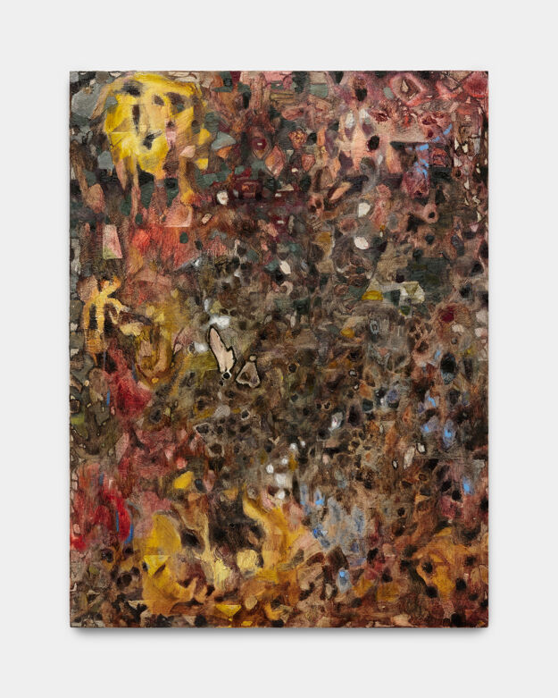Rachel Hayden’s paintings seek order in chaos by puzzle-piecing together a handful of objects into balanced and symmetrical compositions. The artist creates full yet uncluttered canvases where figures float harmoniously in midair without touching. Hayden’s work repeatedly depicts different iterations of a small number of natural subjects, such as rainbows and shooting stars—often anthropomorphized with human faces.