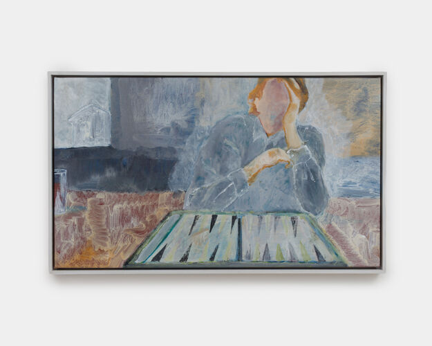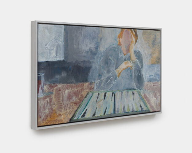 This painting depicts a figure standing before a colorful, patterned wall where a similarly exuberant piece of art hangs in a frame. For this painting, the artist was inspired by the movie "B.A.P.S." (starring Hallie Berry) and its narrative centered on two wealthy women who came from humble beginnings. Rose's work is highly influenced by the aesthetic of the '90s and the idea that Black women can have a luxurious lifestyle that affords them the privilege of buying art.