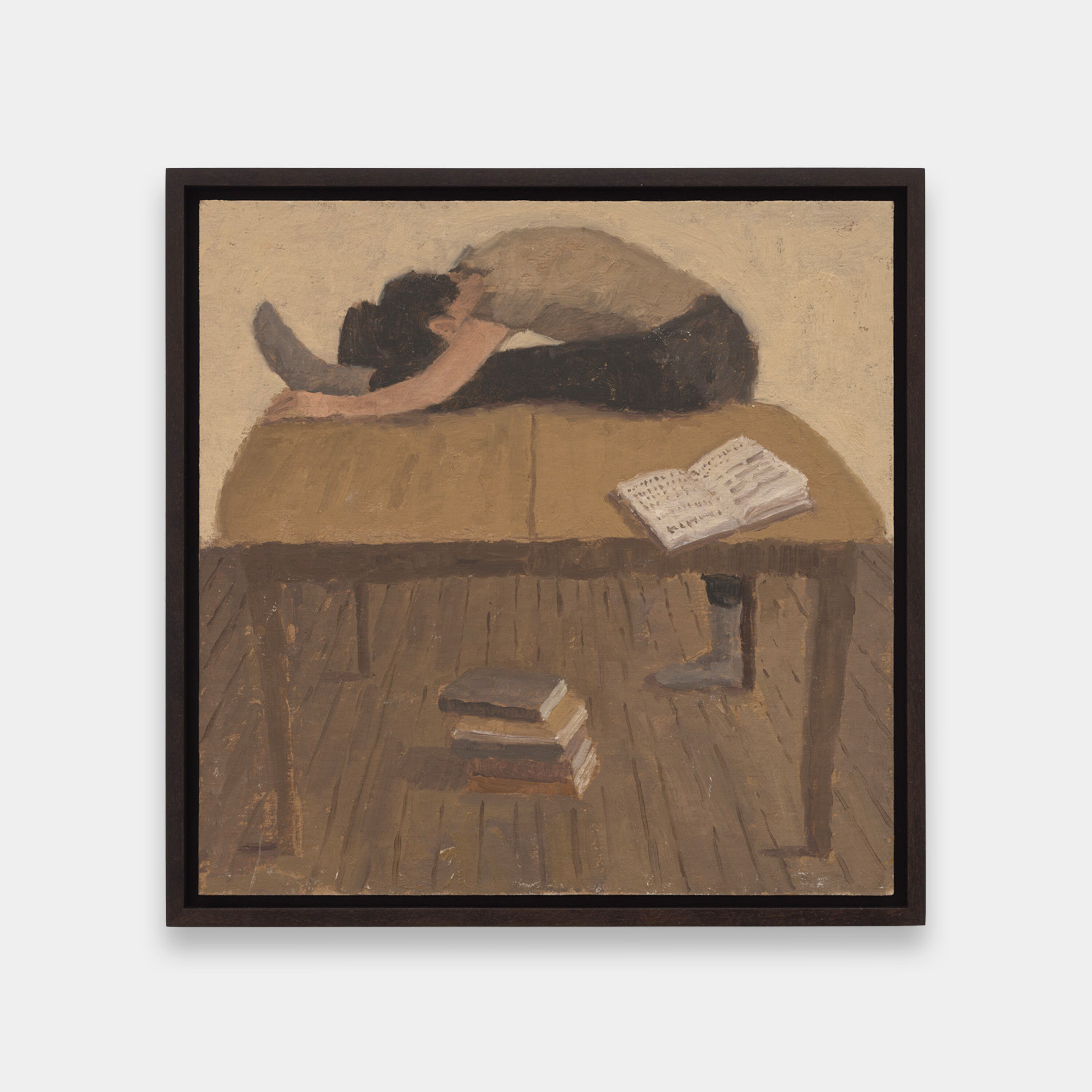 Brown Chair Dance is part of a series of intimate domestic portraits Borsos renders of his partner Lily Akerman, turning everyday moments into poetic musings. In each delicate, small-scale painting, Borsos quiets and slows the passage of time to capture Akerman in various twisting postures. Choreographed yet fluid, the still, decluttered compositions remove the reticent veil of the mundane to reveal the mystery, excitement, and love embedded within, and often occluded by the everyday.