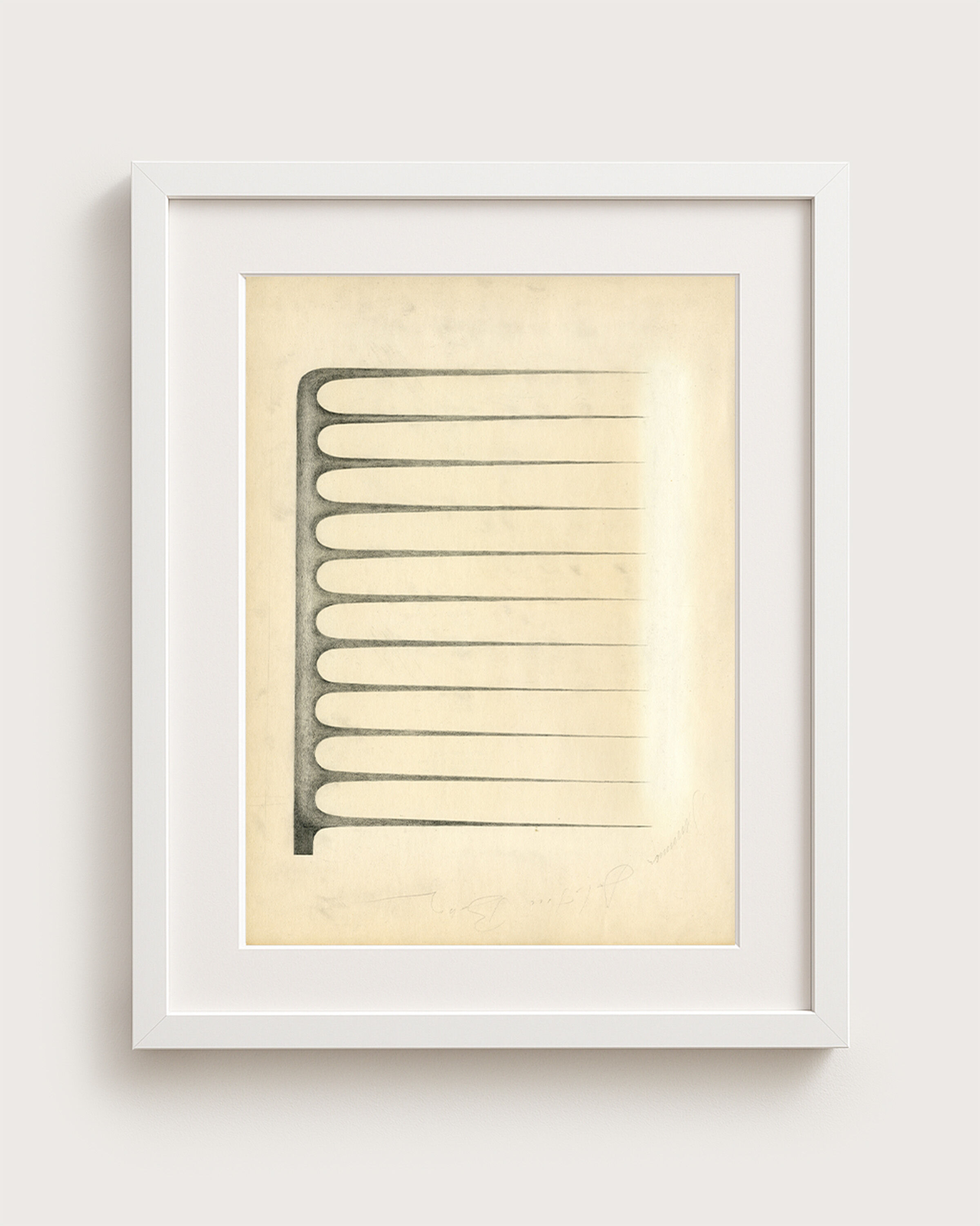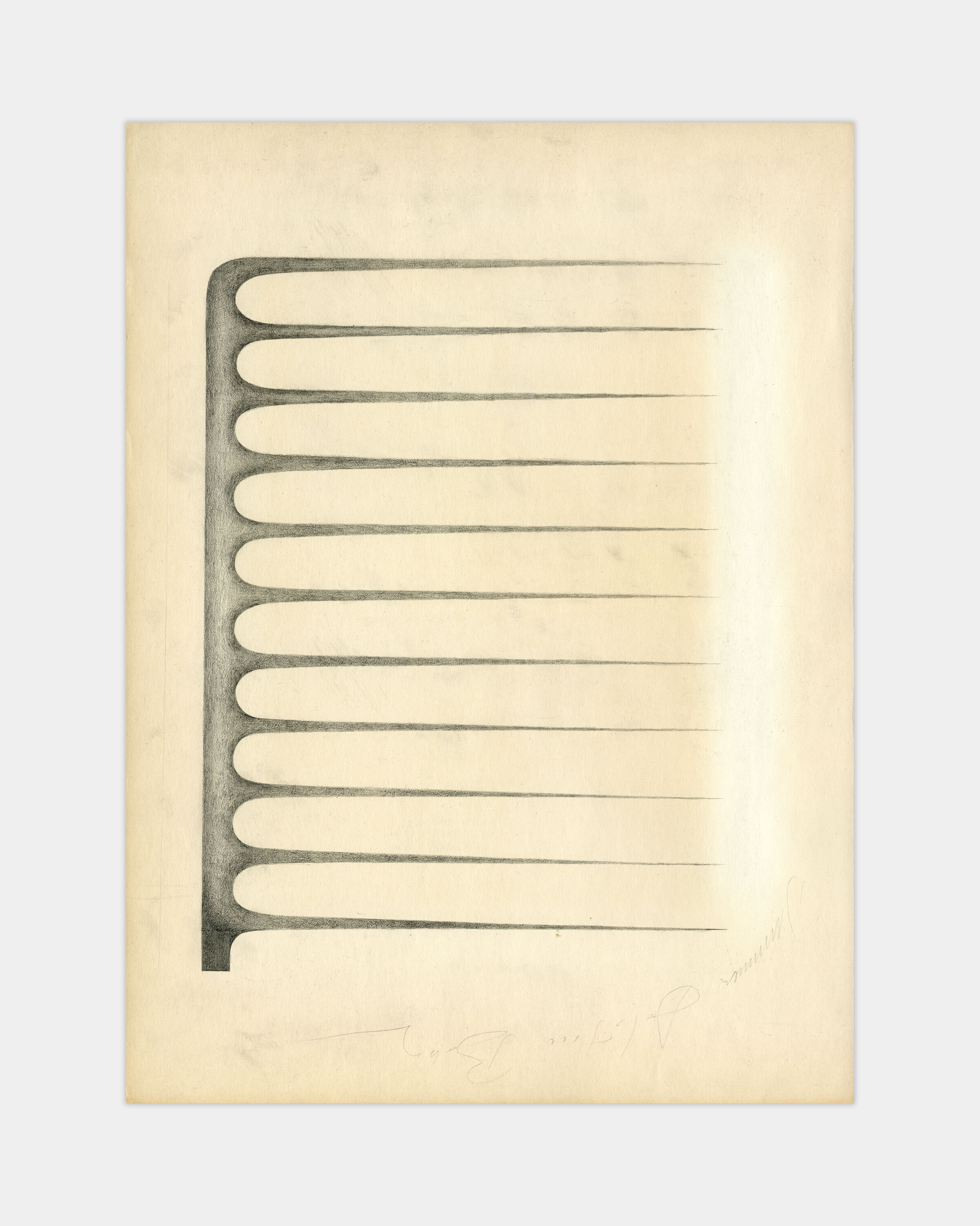 These four pencil drawings on vintage mounting paper (from 1950s mass-produced art print portfolios) are part of an ongoing series of about 250 works begun in 2010. The series unfolds as a world of dream-like visions, abstracted glyphs, and sculptural forms developed through a meditative process that responds to each page’s natural marks—sun damage, creases, or ghosting from removed prints—transforming them into compositional cues.