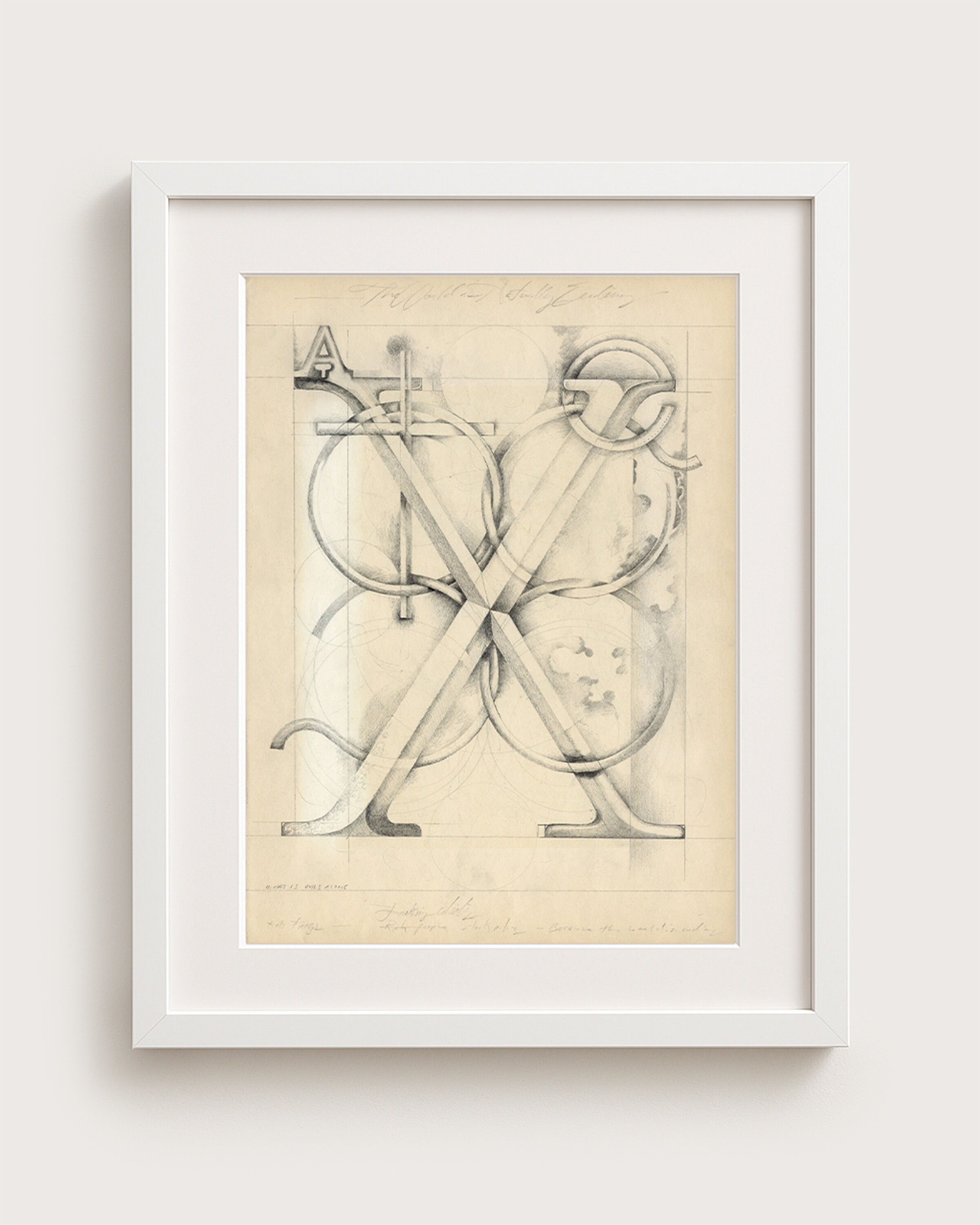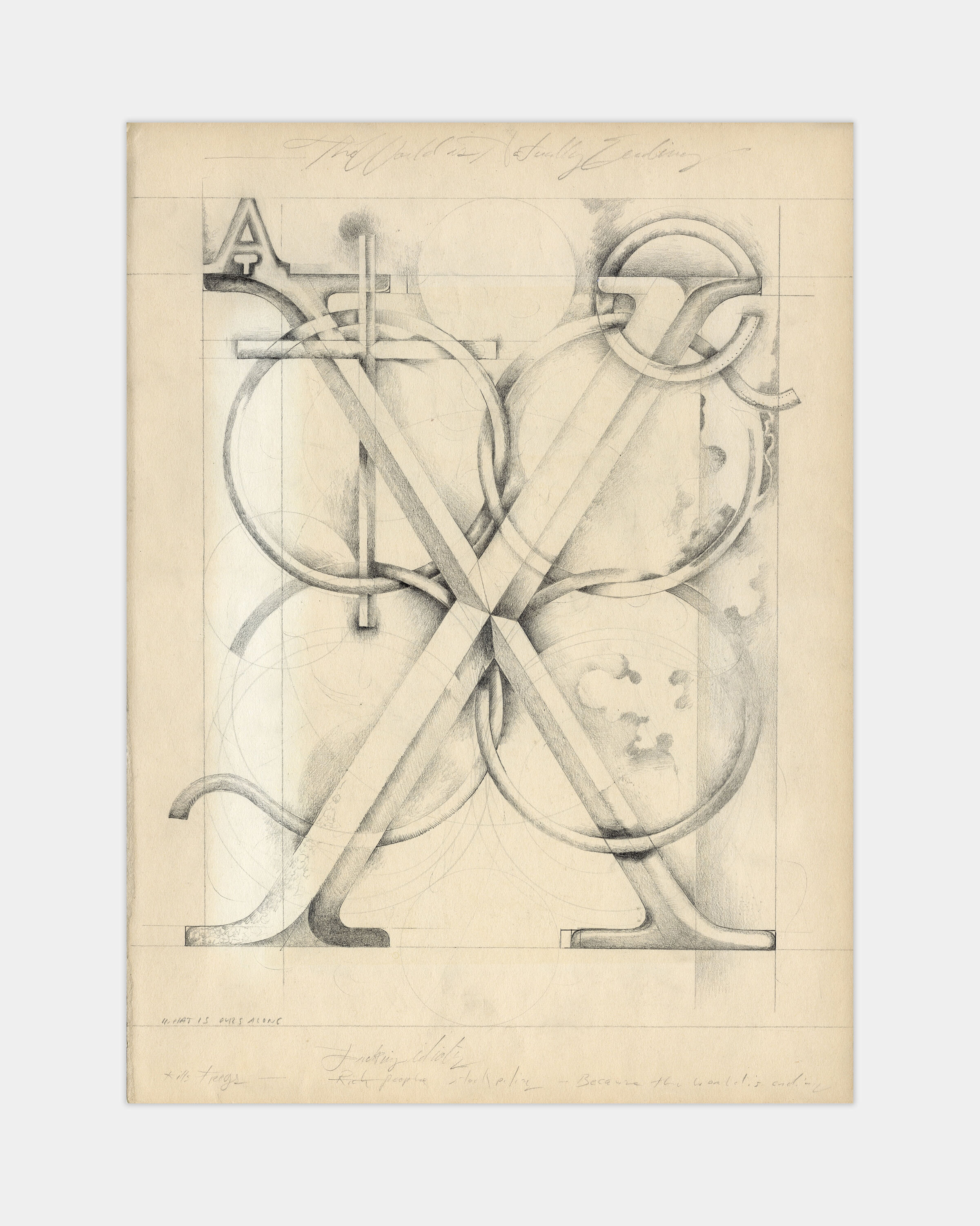 These four pencil drawings on vintage mounting paper (from 1950s mass-produced art print portfolios) are part of an ongoing series of about 250 works begun in 2010. The series unfolds as a world of dream-like visions, abstracted glyphs, and sculptural forms developed through a meditative process that responds to each page’s natural marks—sun damage, creases, or ghosting from removed prints—transforming them into compositional cues.