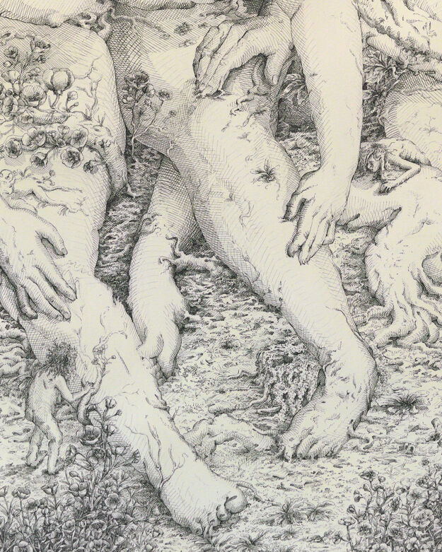 The drawings continue the artist’s interest in the grotesque and in hybrid bodies- images that appear calm at first but hold tension and unease beneath the surface. These forms exist in an in-between state, shifting between human and nonhuman, plant and flesh, revealing how unstable the boundaries we create for ourselves truly are.