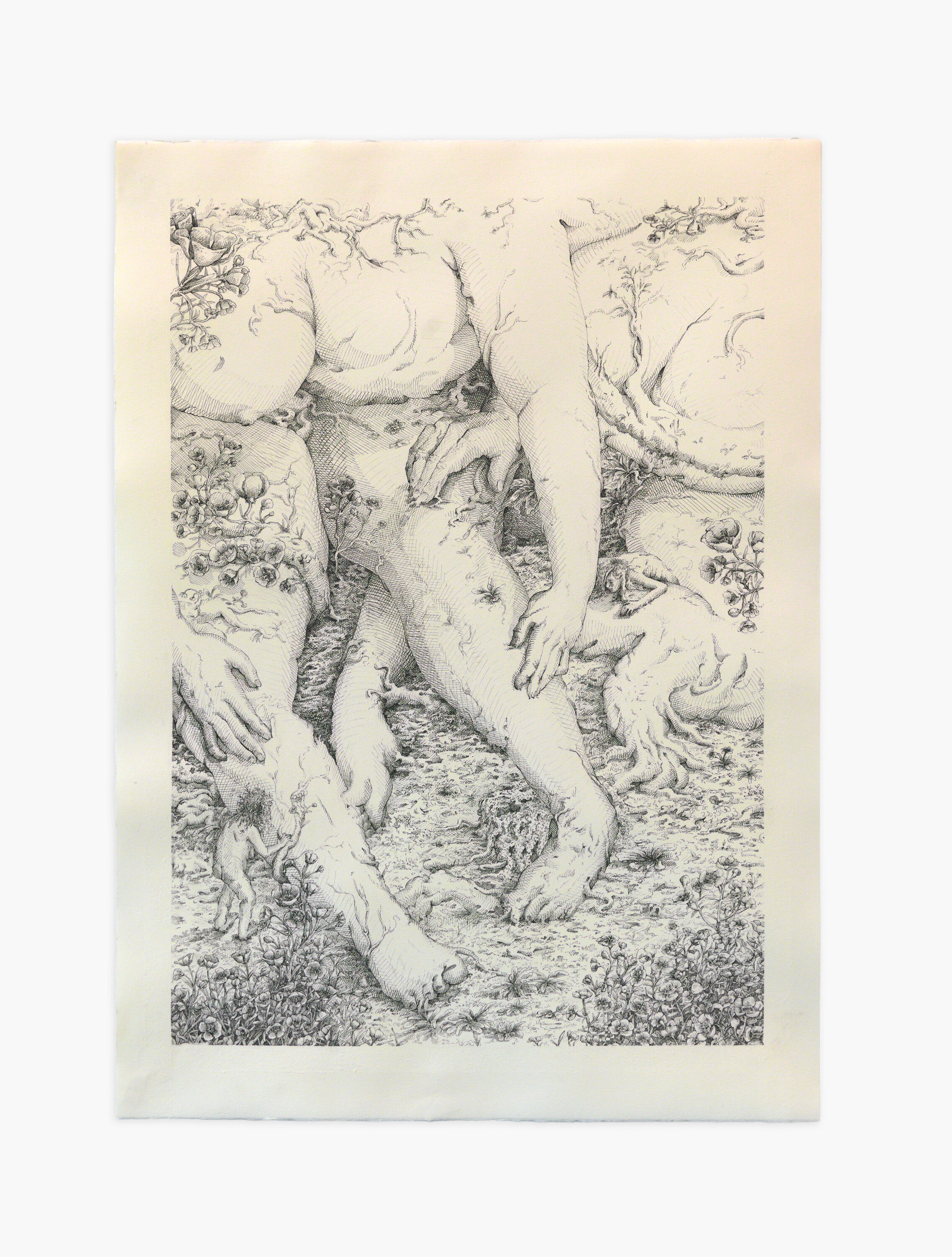 The drawings continue the artist’s interest in the grotesque and in hybrid bodies—images that appear calm at first but hold tension and unease beneath the surface. These forms exist in an in-between state, shifting between human and nonhuman, plant and flesh, revealing how unstable the boundaries we create for ourselves truly are.