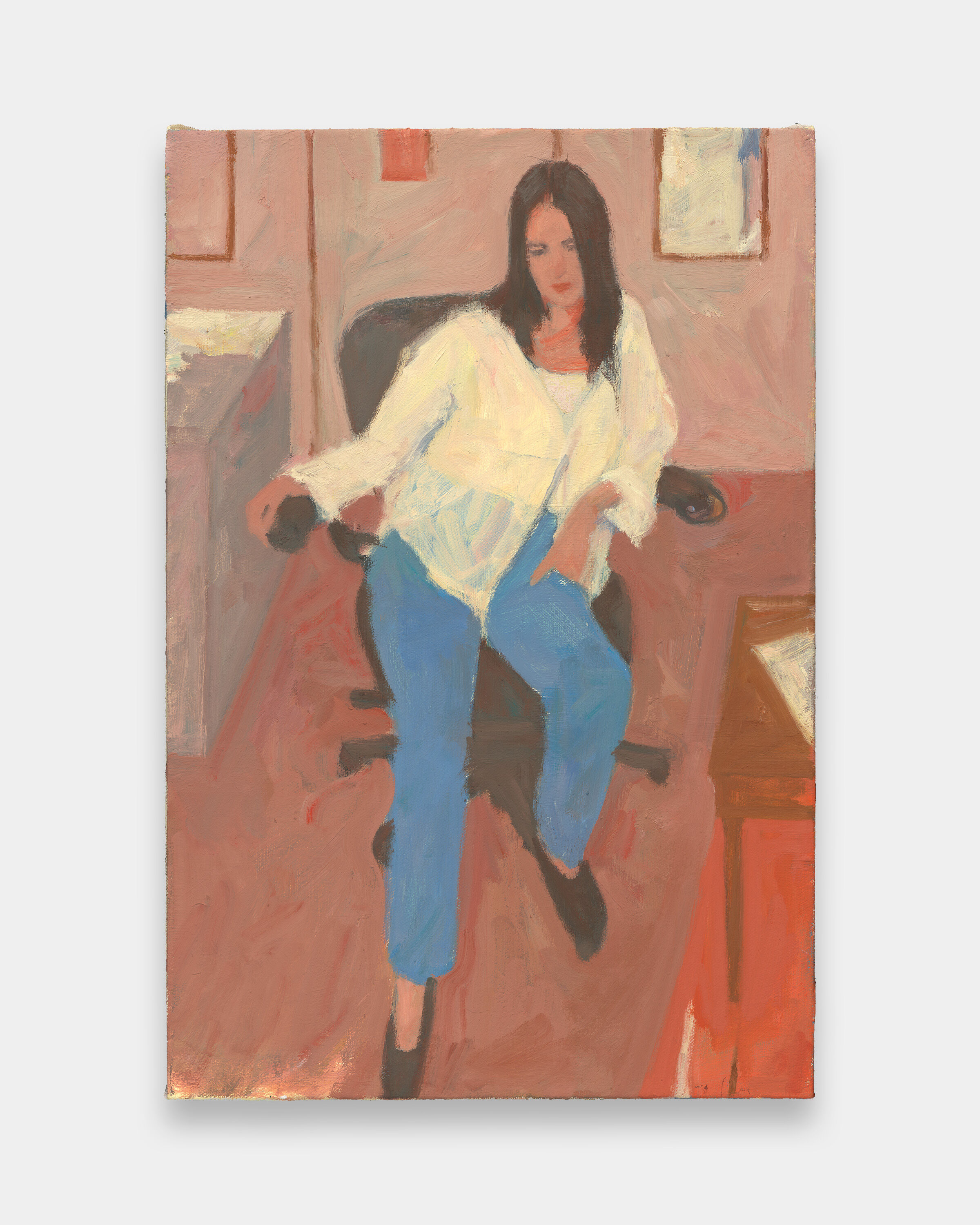 These paintings depict scenes from the studio, with varying degrees of fidelity to the objects and people they appear to represent. They often begin with a subject drawn from life, then are built up through a composite of other objects in the studio, as well as invented elements that complement the composition. The colors are pushed back and forth throughout the process, though they never settle on the studio’s actual white walls and dark gray floor. Some works incorporate the strong afternoon light that enters through the large west-facing window, while others discard a discernible light source in favor of flatter color.