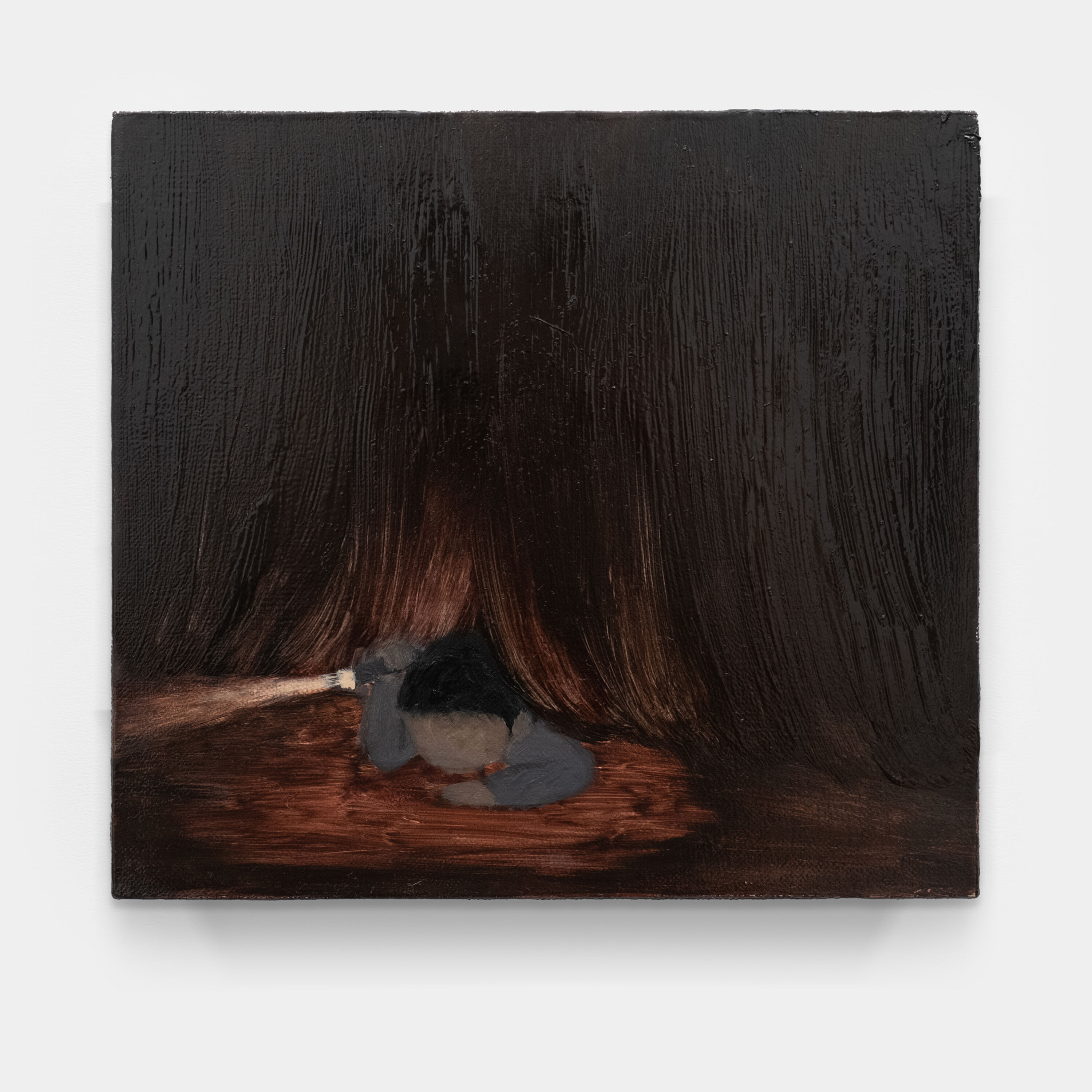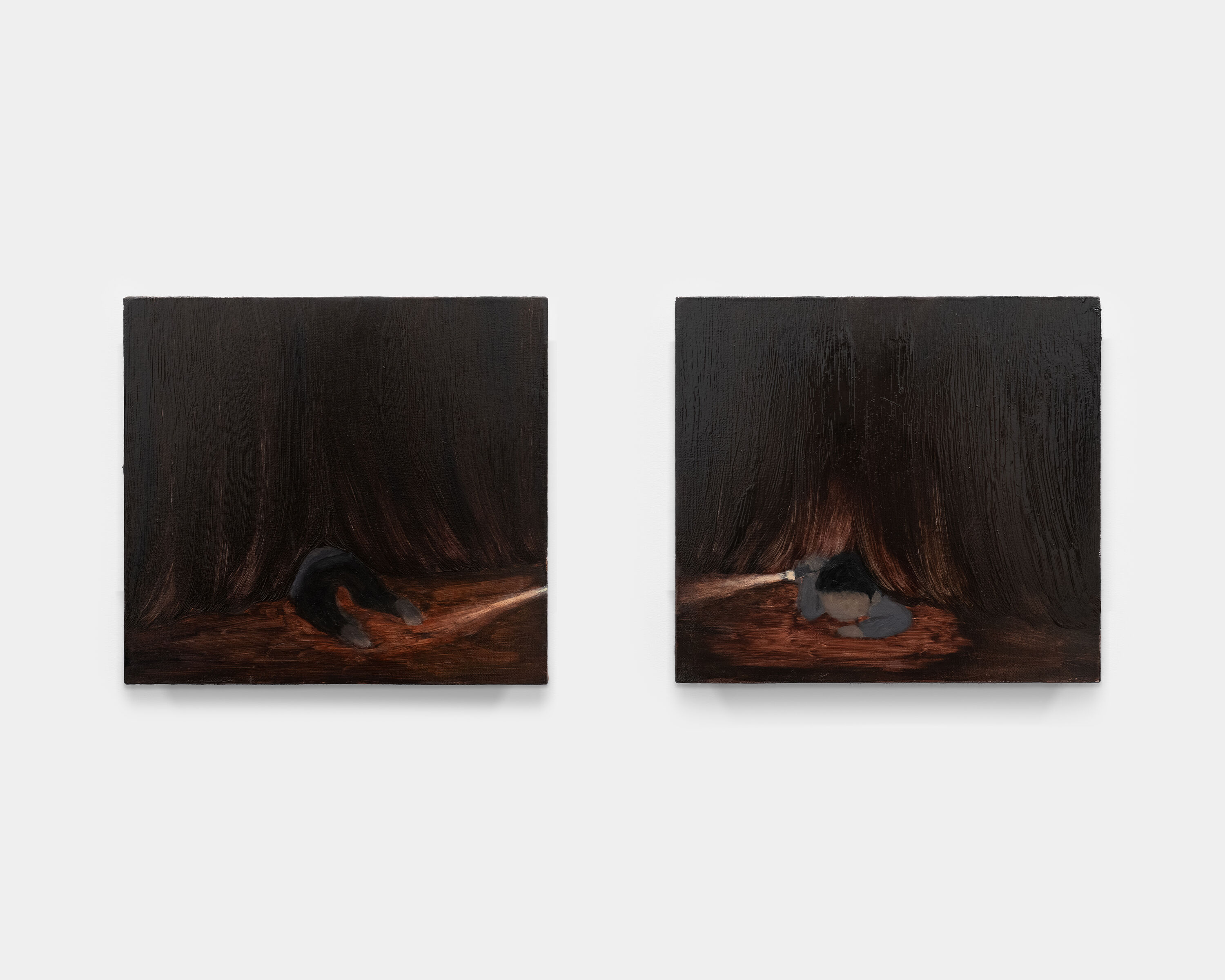 This diptych extends the theme of hide and seek and creates a heightened rhythm of tension. In the left panel, a figure retreats beneath a heavy curtain, while in the right, the same curtain frames the figure leaning outward, holding a flashlight and actively searching. The identical setting and attire allow dual readings: as a game of escape and pursuit, or as two perspectives of the same figure within one scene.