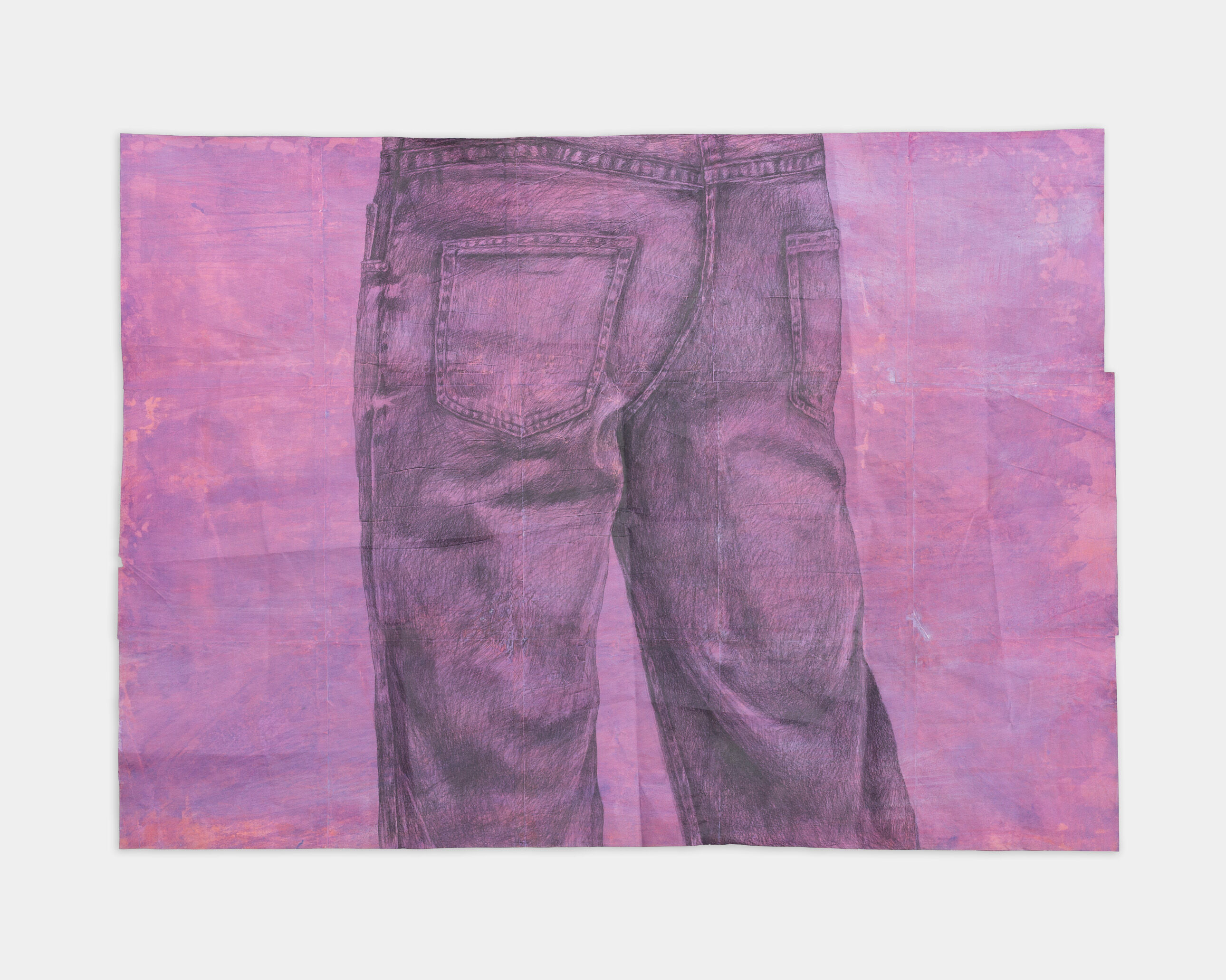 The marks in this drawing were made to feel textured and hypnotic. It is a drawing about a momentary pang of longing, which is not only channeled through its marks, but also through its ominous, glowing purple color and its slightly larger-than-life scale. Often installed on the wall below one's line of sight, viewers are asked to look down at it, effectively placed in a passive position of voyeur. The rest of the figure's body exists beyond the edges: a withholding of visual information that attempts to invoke a sense of anonymity and curiosity.